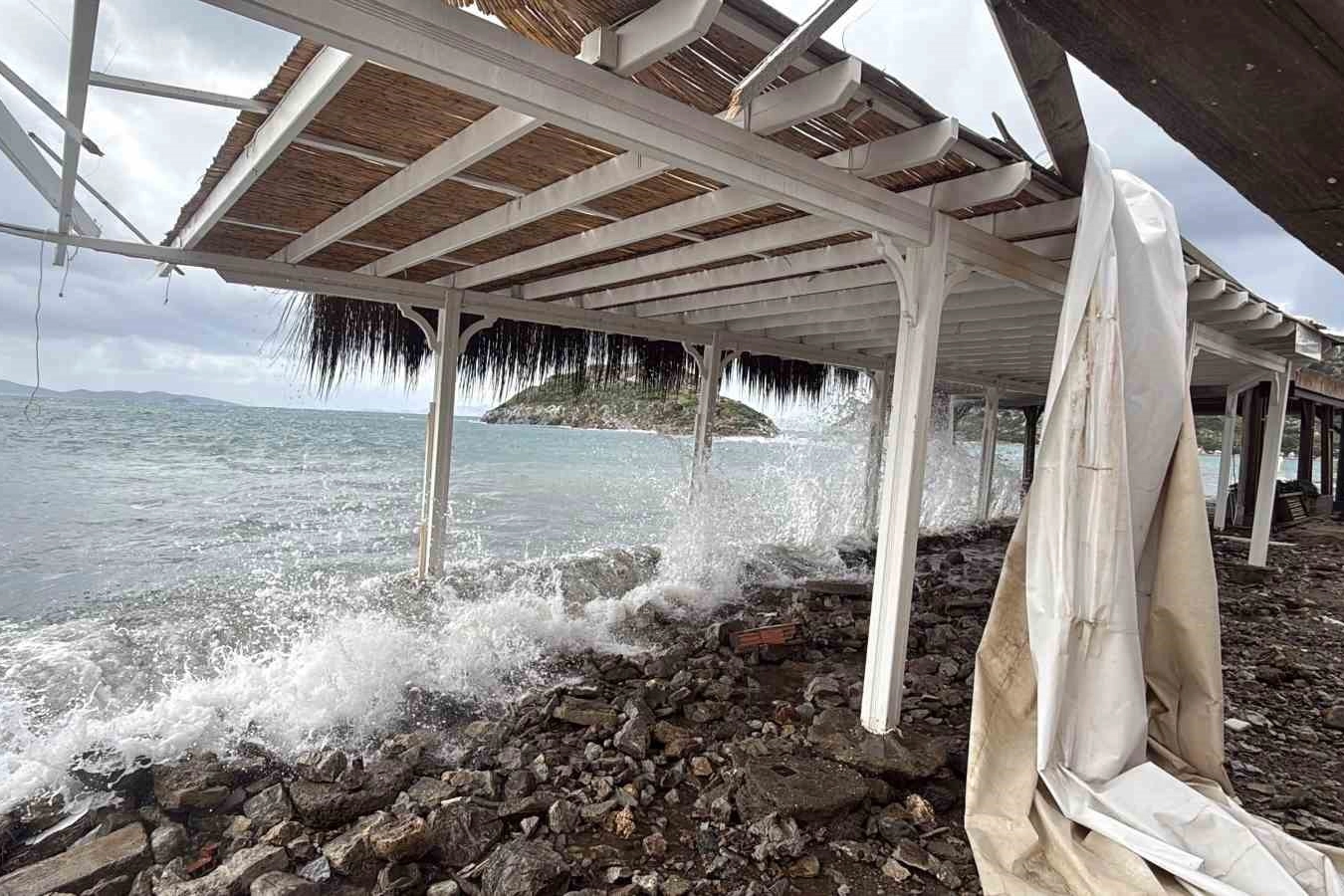 Sahil boyunca birçok işletmenin camları tuzla buz oldu. Ahşap platformlar parçalanırken, çatı tenteleri yerinden koparak savruldu. Masa ve sandalyeler rüzgarla birlikte yollara dağıldı.