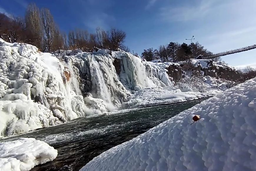 Yaklaşık 20 metre yükseklikten dökülen şelalenin bazı bölümleri tamamen buz tutarken, dev buz sarkıtlarının arasından akmaya devam eden su, izleyenlere büyüleyici bir görsel şölen sundu. Çevresindeki bembeyaz kar örtüsüyle bütünleşen şelale, adeta bir kış masalını andıran görüntüleriyle ziyaretçilerini kendine hayran bıraktı.