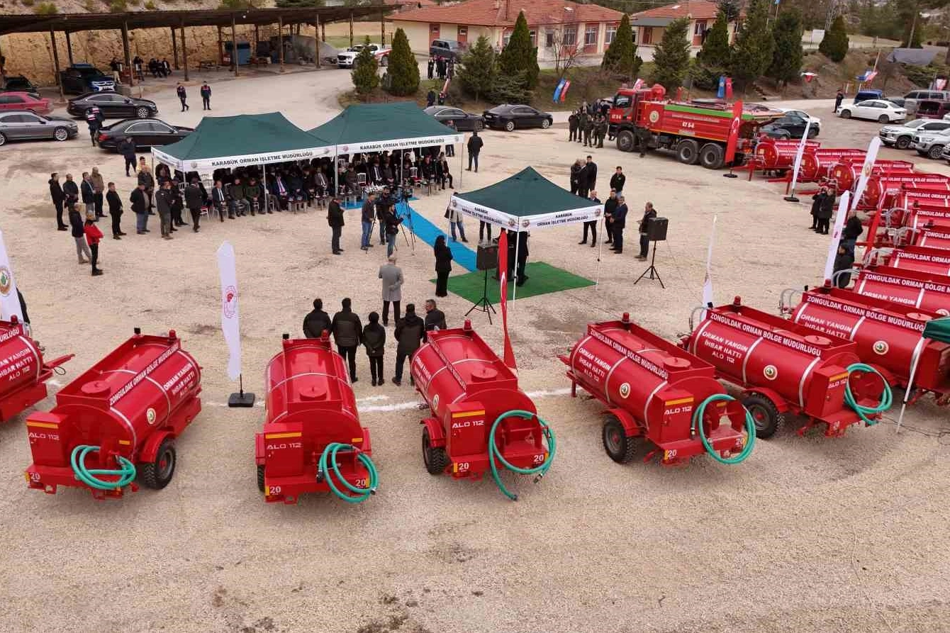 Karabük’te orman yangınlarına karşı yürütülen önlemler kapsamında 20 yeni su tankeri orman köylerine teslim edildi. Zonguldak Orman Bölge Müdürlüğü tarafından düzenlenen törenle birlikte kentte teslim edilen tanker sayısı 84’e ulaştı.