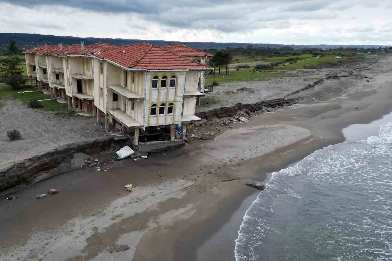 Sakarya’nın Karasu ilçesinde belirli bir sahil şeridinde etkili olan kıyı erozyonu, bir dönemin popüler projelerinden olan eski bir tatil köyündeki villa ve havuzların çökmesine neden oldu. Dalgaların kıyıyı aşındırmasıyla tehlikenin büyümesi üzerine Çevre, Şehircilik ve İklim Değişikliği Bakanlığı harekete geçerek bölgede kapsamlı bir çalışma başlattı.