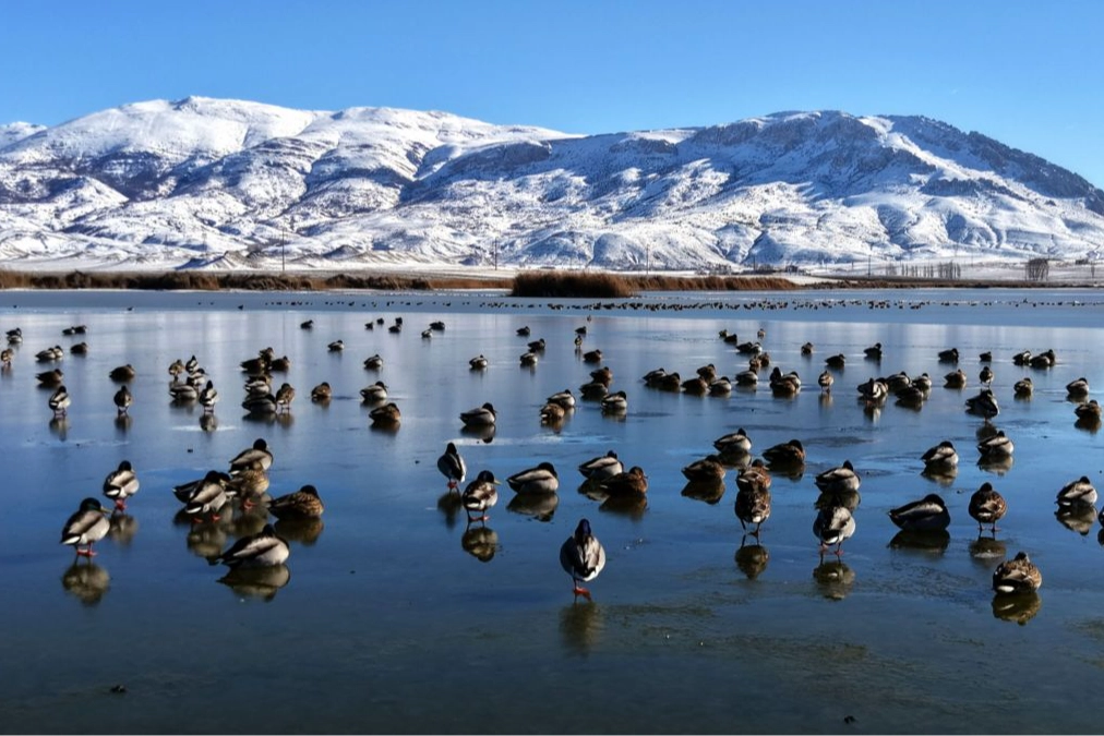 Sivas'ın Ulaş ilçesinde bulunan ve "Ulusal Öneme Haiz Sulak Alan" statüsündeki Ulaş Gölü, dondurucu soğuklara teslim oldu. Yüzeyi buzla kaplanan gölün daimi sakinleri olan yeşilbaş ve elmabaş patka ördekleri, buz tutmayan küçük su birikintilerine sığınarak görsel bir şölen oluşturdu.