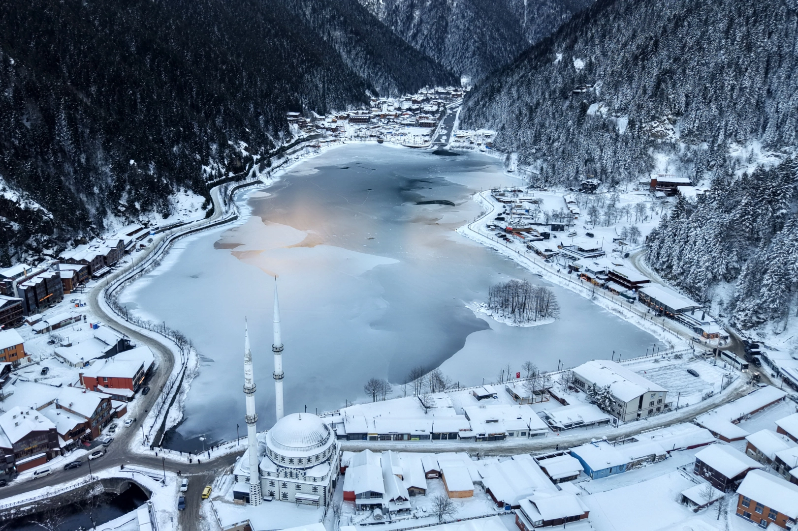 Trabzon’un Çaykara ilçesinde yer alan ve Türkiye’nin en bilinen turizm merkezlerinden biri olan Uzungöl, etkili olan kar yağışının ardından beyaz örtüyle kaplandı. Denizden bin 250 metre yükseklikte bulunan doğa harikası gölün yüzeyinin büyük kısmı, hava sıcaklıklarının sıfır derecenin altına düşmesiyle buz tuttu. Ortaya çıkan seyirlik manzara, ziyaretçilerin ilgisini çekerken dron ile havadan görüntülendi.