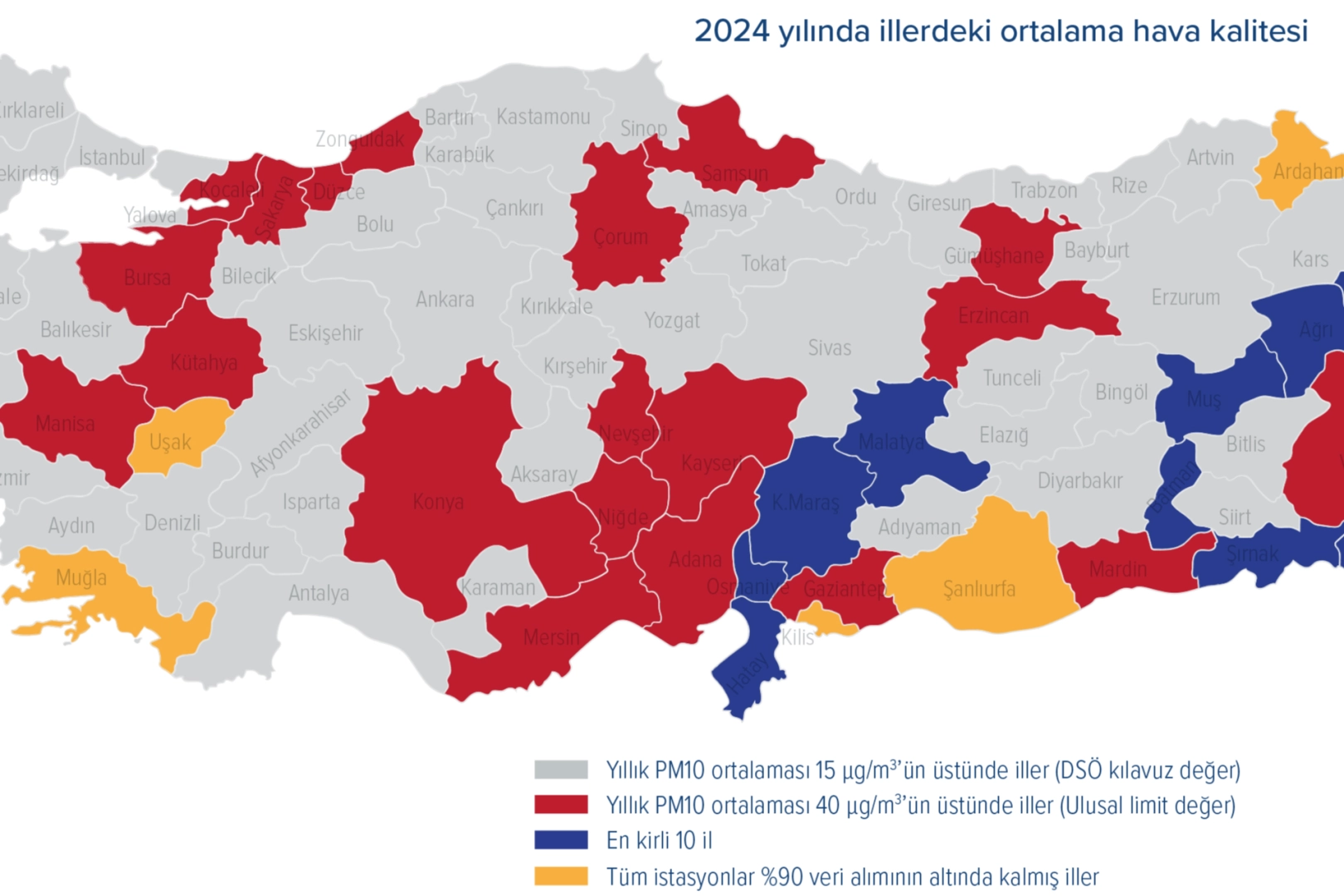 2024’te Hava Kalitesi İyi İl Yok Kara Rapor’a göre 2024’te hiçbir ilin yıllık ortalama hava kalitesi Dünya Sağlık Örgütü’nün önerdiği kılavuz değerlere göre temiz değil. ‘Osmaniye, Iğdır ve Malatya partikül madde kirliliği en yüksek ilk üç il oldu. Kirliliğin en önemli kaynaklarından biri trafik olarak ortaya çıktı. En kirli ilk 10 ile bakıldığında bu illerin Akdeniz bölgesinin doğusunda ve güneydoğu Anadolu’da yoğunlaştığı gözlendi. Sanayinin ve termik santrallerin olduğu bölgeler olan Bursa Kestel, Osmaniye ve Şırnak’ta halk, 250 günün üzerinde yani yılın yüzde 70’inde sağlıksız havaya maruz kaldı. Osmaniye halkı, 2024 yılı boyunca ortalamada 83,60 µg/m3 partikül madde soludu. Bu, DSÖ’nün önerdiği en yüksek kirlilik düzeyinin 5 katından, Türkiye’de yasal sınırın 2 katından fazla.