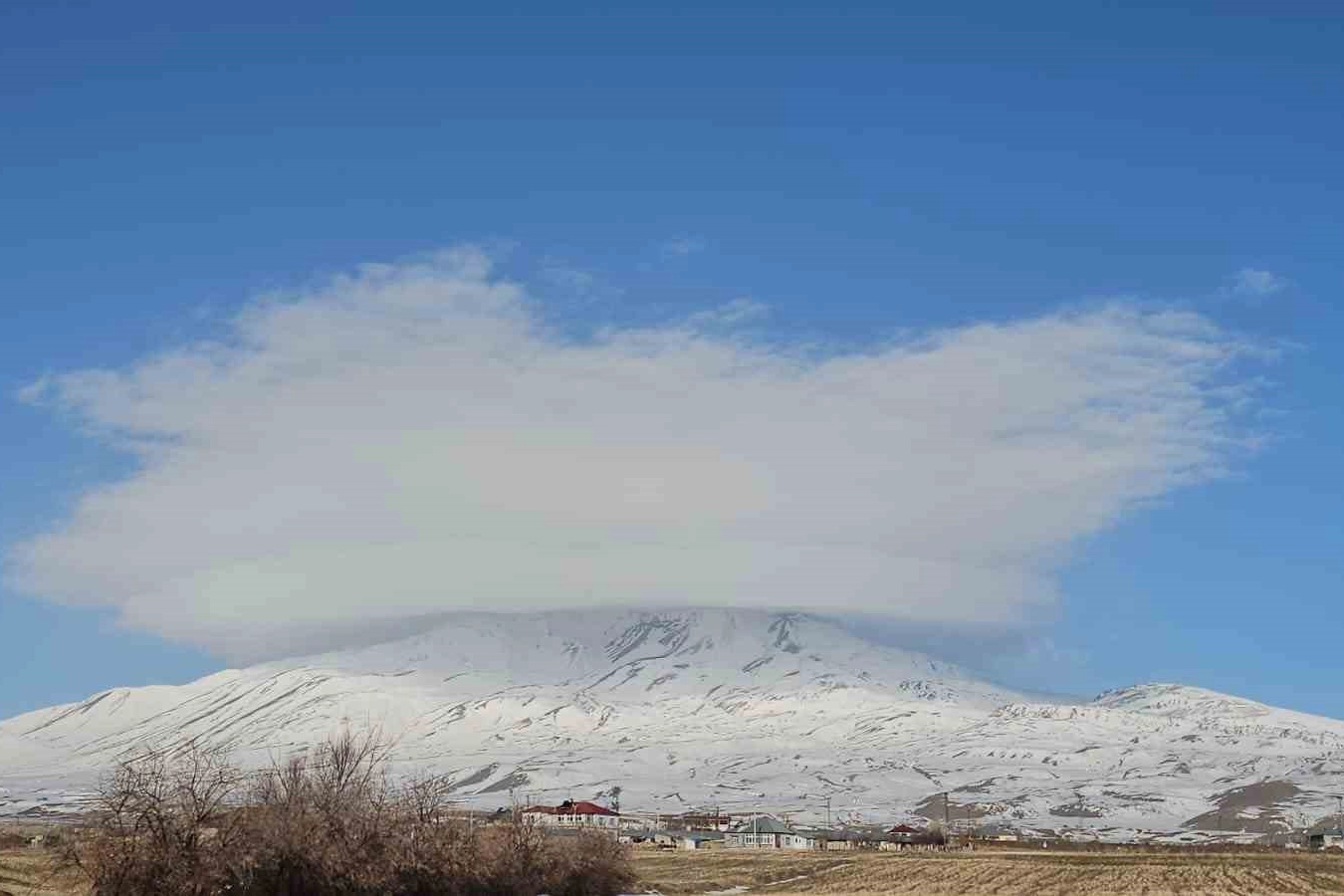 Süphan Dağı’nın karla kaplı zirvesi üzerinde beliren bulut, özellikle sabah ışığıyla birlikte kartpostallık manzaralar oluşturdu. Bölgedeki vatandaşlar o anları cep telefonlarıyla kaydederek sosyal medyada paylaştı.