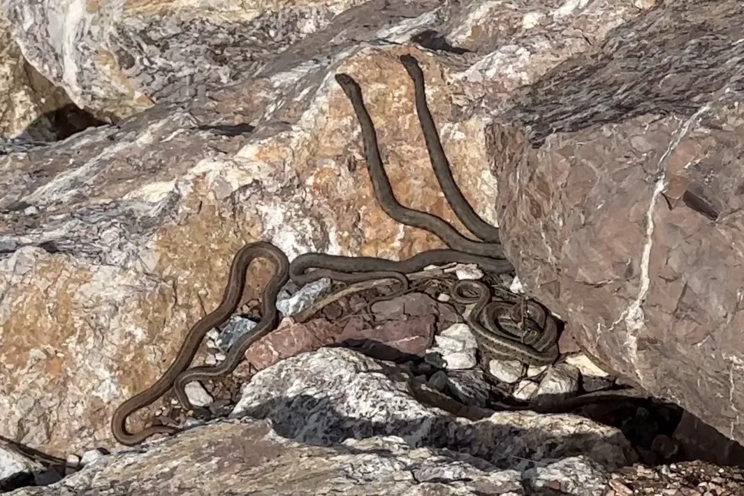 Yüksekova'da sürü halinde güneşlenen zararsız yılanlar, Brezilya’nın Yılan Adası'nı andıran manzarasıyla dikkat çekiyor.