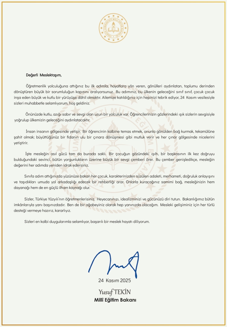 Bakan Tekin, göreve yeni başlayan öğretmenler için kaleme aldığı mektubunda, "Değerli meslektaşım; öğretmenlik yolculuğuna attığınız bu ilk adımla hayatlara yön veren, gönülleri aydınlatan, toplumu derinden dönüştüren büyük bir sorumluluğun kapısını aralıyorsunuz. Bu adımınız, bu ülkenin geleceğini sınıf sınıf, çocuk çocuk inşa eden büyük ve kutlu bir yürüyüşe dahil olmaktır. Ailemize katıldığınız için hepinizi tebrik ediyor, 24 Kasım vesilesiyle sizleri muhabbetle selamlıyorum, hoş geldiniz. Önünüzde kutlu, azığı sabır ve sevgi olan uzun bir yolculuk var. Öğrencilerinizin gözlerindeki ışık sizlerin sevgisiyle yoğrulup ülkemizin geleceğini aydınlatacaktır. İnsan insanın gölgesinde yetişir. Bir öğrencinin kalbine temas etmek, onunla gönülden bağ kurmak, tekamülüne şahit olmak; büyüttüğünüz bir fidanın ulu bir çınara dönüşmesi gibi mutluluk verir ve her çınar gölgesinde nicelerini yetiştirir. İşte mesleğin asıl gücü tam da burada saklı. Bir çocuğun gözündeki ışıltı, bir başkasının ilk kez doğruyu bulduğundaki sevinci, bütün yorgunlukların üzerine büyük bir sevgi çemberi örer. Bu çember genişledikçe, mesleğin değerini her adımda yeniden idrak edersiniz. Sınıfa adım attığınızda yüzünüze bakan her çocuk, karakterinizden süzülen adaleti, merhameti, doğruluk anlayışını ve taşıdıkları umuda yol arkadaşlığı edecek bir rehberliği arar. Onlarla kuracağınız samimi bağ, mesleğinizin hem dayanağı, hem de en güçlü ilham kaynağı olur. Sizler, 'Türkiye Yüzyılı'nın öğretmenlerisiniz. Heyecanınızı, idealizminizi ve gücünüzü diri tutun. Bakanlığımız bütün imkanlarıyla yanı başınızdadır. Ben de bir ağabeyiniz olarak hep yanınızda olacağım. Mesleki gelişiminiz için her türlü desteği vermeye hazırız, kararlıyız. Sizleri en kalbi duygularımla selamlıyor, başarılı bir meslek hayatı diliyorum" dedi.