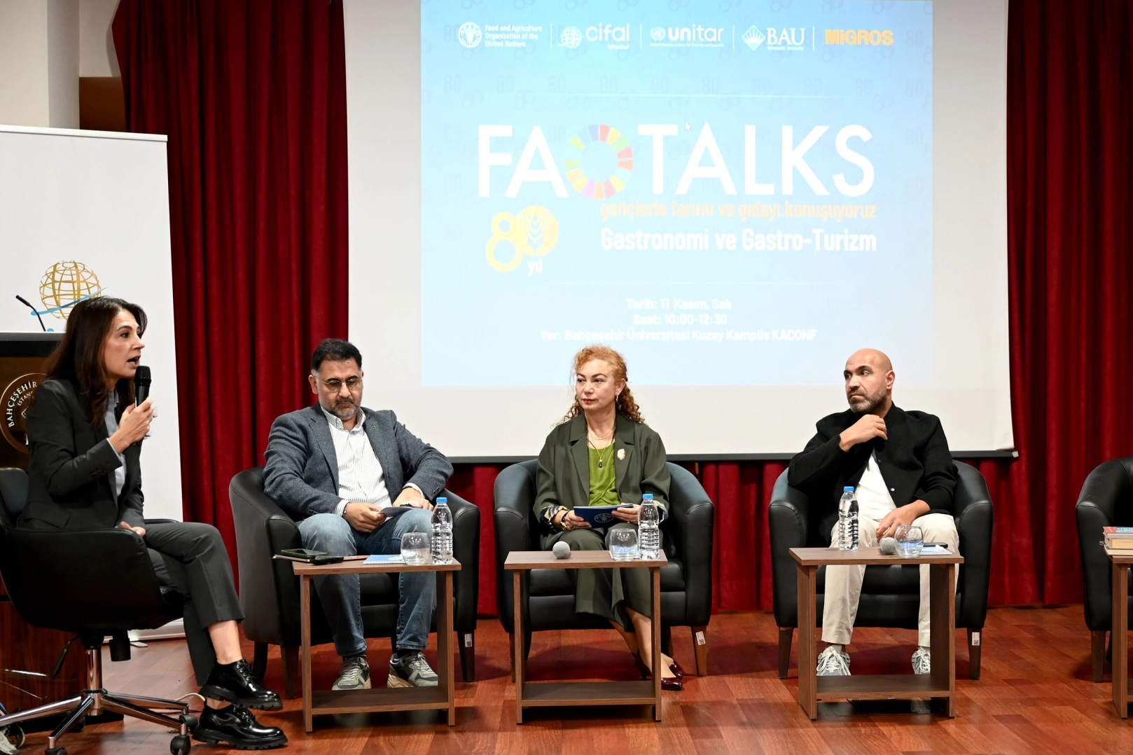 FAO Türkiye Temsilciliği, BM Eğitim ve Araştırma Enstitüsü (UNITAR) Yönetici ve Liderler için Uluslararası Eğitim Uygulama ve Araştırma Merkezi CIFAL İstanbul, Bahçeşehir Üniversitesi ve MİGROS iş birliğiyle düzenlenen ‘FAO Talks: Gençlerle Tarımı ve Gıdayı Konuşuyoruz’ etkinliği BAU Kuzey Kampüs’te gerçekleşti. Sürdürülebilir üretim, gıda güvenliği ve iklim dostu tarım politikaları konularında farkındalık oluşturmak ve gençlerin bilgi birikimiyle enerjilerinin Sürdürülebilir Kalkınma Amaçları’na (SKA) katkısını teşvik etmek amacıyla planlanan etkinliğin açılışında CIFAL İstanbul - UNITAR Direktörü Prof. Dr. Çisil Sohodol, FAO Türkiye Temsilci Yardımcısı Dr. Ayşegül Selışık, BAU Uygulamalı Bilimler Müdürü Prof. Dr. Kazım Ozan Özer, BAU Sağlık Bilimleri Fakültesi Dekan Yardımcısı Dr. Öğr. Üyesi İlayda Altuncevahir, Migros Sürdürülebilirlik Müdürü Murat Birsin konuşma yaptılar.