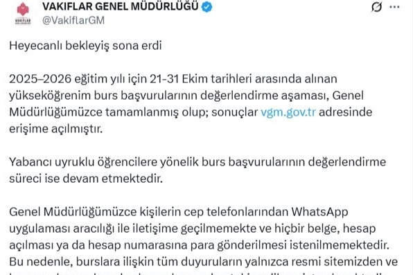 Vakıflar Genel Müdürlüğü'nün sosyal medya hesabından yapılan açıklamada, "Heyecanlı bekleyiş sona erdi. 2025-2026 eğitim yılı için 21-31 Ekim tarihleri arasında alınan yükseköğrenim burs başvurularının değerlendirme aşaması, Genel Müdürlüğümüzce tamamlanmış olup; sonuçlar http://vgm.gov.tr adresinde erişime açılmıştır. Yabancı uyruklu öğrencilere yönelik burs başvurularının değerlendirme süreci ise devam etmektedir. Genel Müdürlüğümüzce kişilerin cep telefonlarından WhatsApp uygulaması aracılığı ile iletişime geçilmemekte ve hiçbir belge, hesap açılması ya da hesap numarasına para gönderilmesi istenilmemektedir. Bu nedenle, burslara ilişkin tüm duyuruların yalnızca resmi sitemizden ve kurumsal sosyal medya hesaplarımızdan takip edilmesi gerekmektedir. Açıklamanın tüm başvuru sahipleri için hayırlı olmasını temenni eder, eğitim hayatlarında başarılar dileriz" denildi.