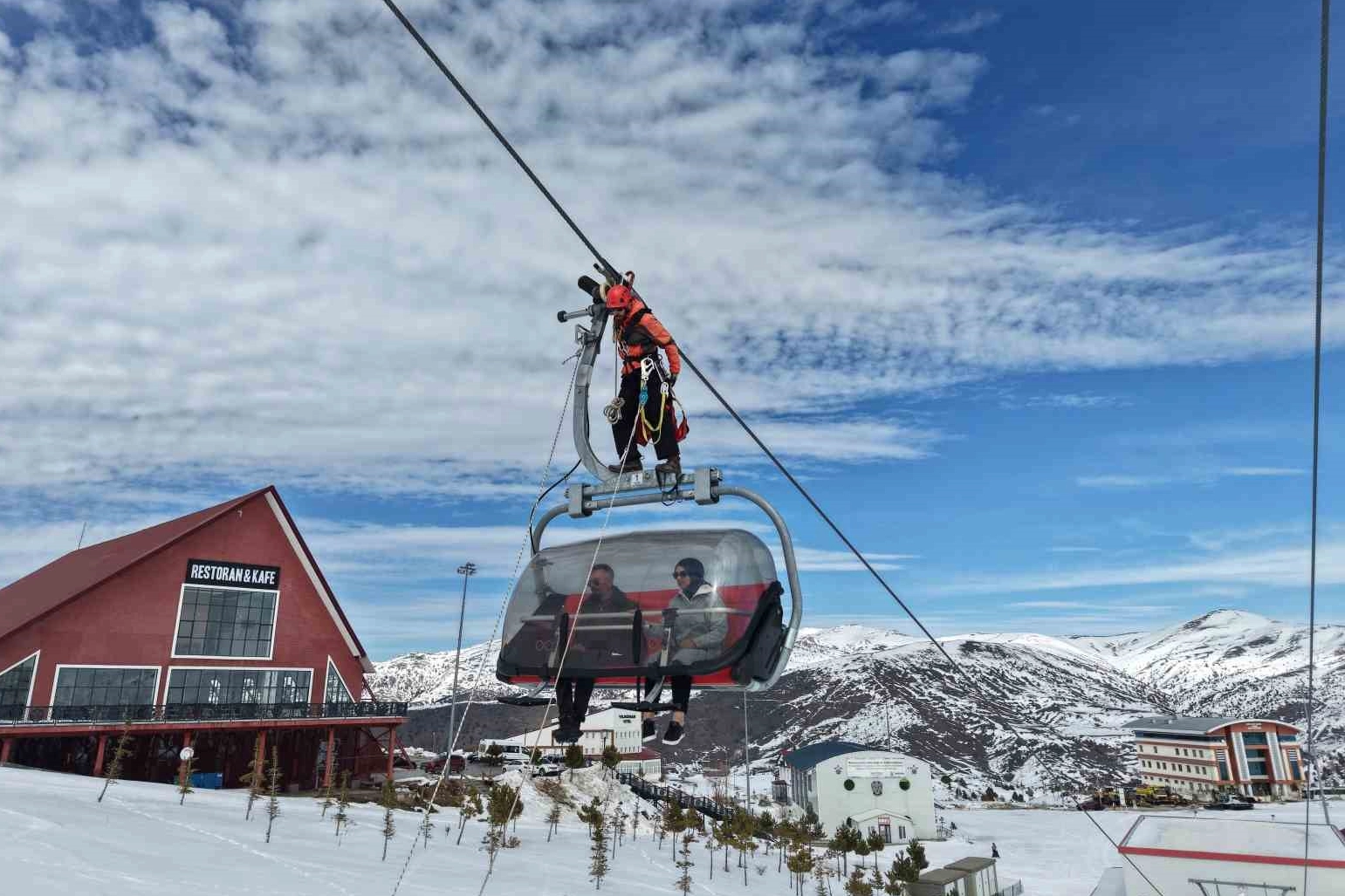 Senaryo gereği mekanik sistemde yaşanan teknik bir arıza nedeniyle sporcular telesiyejlerde asılı kaldı. İhbarın ardından kısa sürede bölgeye ulaşan ekipler, özel ekipmanlar kullanarak sporcuları güvenli bir şekilde zemine indirdi. Tahliye edilen ve senaryo gereği yaralanan kişilere, bölgede hazır bekletilen UMKE ekipleri tarafından ilk müdahale yapılarak ambulanslarla hastanelere sevkleri sağlandı.