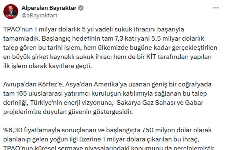 Enerji ve Tabii Kaynaklar Bakanı Alparslan Bayraktar, Türkiye Petrolleri Anonim Ortaklığı’nın (TPAO) küresel sermaye piyasalarında tarihi bir işleme imza attığını duyurdu. TPAO tarafından gerçekleştirilen 1 milyar dolar tutarındaki, 5 yıl vadeli sukuk (kira sertifikası) ihracı başarıyla tamamlandı. Bu işlem, hem Türkiye’de bugüne kadar gerçekleştirilen en büyük şirket kaynaklı sukuk ihracı hem de bir Kamu İktisadi Teşebbüsü (KİT) tarafından yapılan ilk işlem olarak ekonomi tarihine geçti.