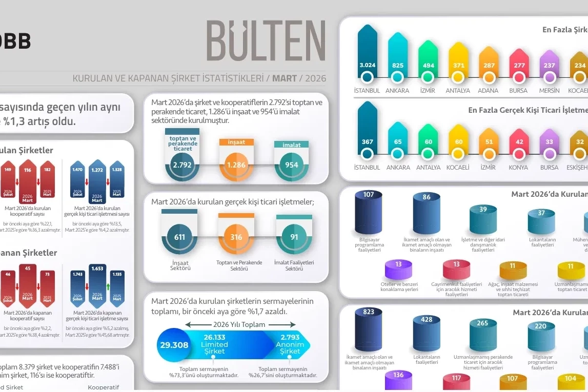 Mart 2026’da bir önceki yılın aynı ayına göre kurulan şirket sayısında önemli bir değişiklik olmazken, kurulan kooperatif sayısı yüzde 36,3 azaldı. Kurulan gerçek kişi ticari işletme sayısı yüzde ise 4,2 azaldı. Kapanan şirket sayısı yüzde 6,4 azalırken, kapanan kooperatif sayısı yüzde 38,4 azaldı, kapanan gerçek kişi ticari işletme sayısı ise yüzde 45,6 arttı.