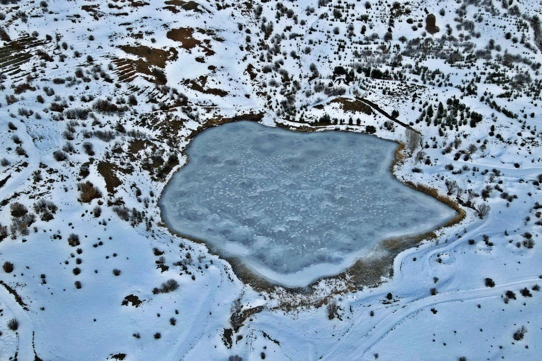 Drone ile havadan kaydedilen görüntülerde, gölün cam gibi pürüzsüz buz tabakası ve etrafını saran karla kaplı tepeler, izleyenlere adeta bir kış masalını andırıyor.