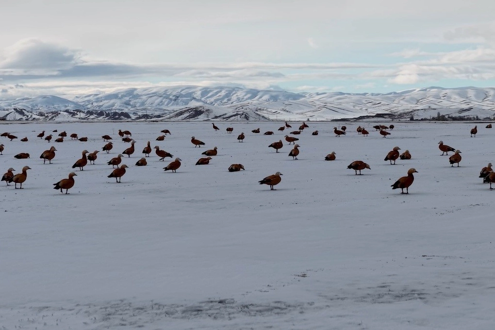 Göç sırasında bölgede mola verdiği değerlendirilen angut kuşlarının oluşturduğu manzara, doğa belgesellerini aratmayan görüntüler ortaya çıkardı. Özellikle karlı zemin üzerinde ilerleyen kuş sürüsü, izleyenlere görsel bir şölen sundu.