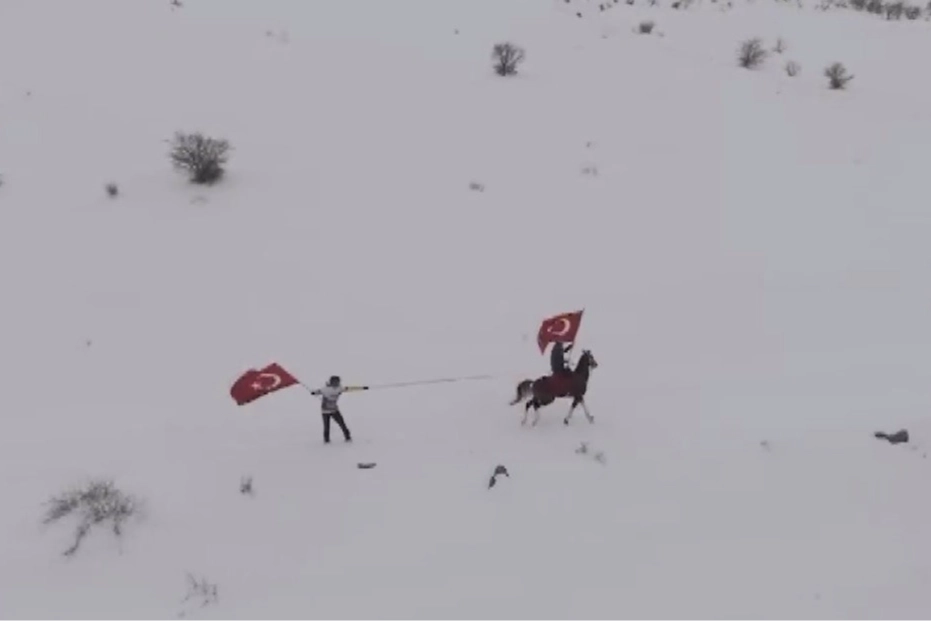 Dörtnala koşan atların arkasında karları yararak süzülen sporcular, ellerinde dalgalandırdıkları Türk bayraklarıyla bu adrenalin dolu anları adeta milli bir coşkuya çevirdi.