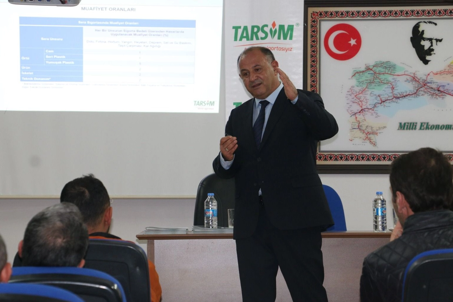Programda daha sonra TARSİM Malatya Bölge Müdürü Bülent Zelyurt, TARSİM tarafından yürütülen ve seracılığa yönelik sigorta uygulamaları hakkında katılımcılara sunum yaptı. TARSİM sigortasının seracılık sektöründe doğal afetlere karşı yürüttüğü prim esasları hakkında bilgi veren TARSİM Bölge Müdürü Bülent Zelyurt, üreticileri oluşabilecek doğal afet zararlarında karşın seralarını ve ürünlerini sigorta kapsamına aldırabileceklerini söyledi.. Üreticilerden gelen soruları da yanıtlayan Zelyurt, TARSİM’in üreticileri ve tarımsal üretimi korumaya devam edeceğini söyledi.
