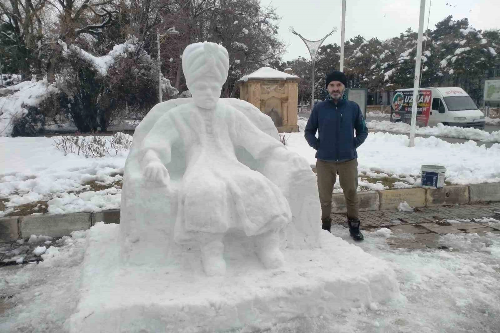 Erzincan’da etkili olan kar yağışı, bu kez sıradan bir kardan adam yerine sanatsal bir figüre dönüştü. Güzel Sanatlar Fakültesi mezunu İsmail İşler, Ordu Caddesi üzerindeki parkta biriken karları kullanarak “kardan padişah” yaptı.