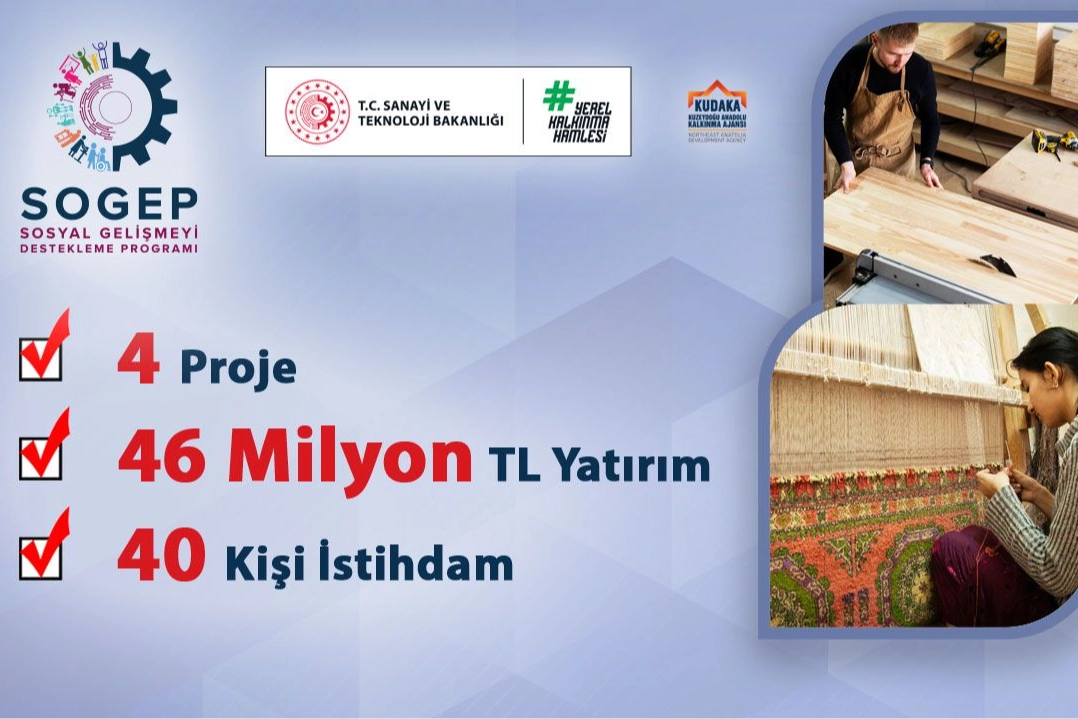 Sanayi ve Teknoloji Bakanlığı koordinasyonunda yürütülen 2025 Yılı Sosyal Gelişmeyi Destekleme Programı (SOGEP) sonuçları açıklandı. Kuzeydoğu Anadolu Kalkınma Ajansı (KUDAKA), yerel dinamikleri harekete geçirecek ve toplumsal refahı artıracak 4 projeye toplam 24 milyon TL mali destek sağlama kararı aldı. Yatırımcıların öz kaynaklarıyla birlikte bölgeye aktarılacak toplam tutar ise yaklaşık 46 milyon TL'yi buluyor.