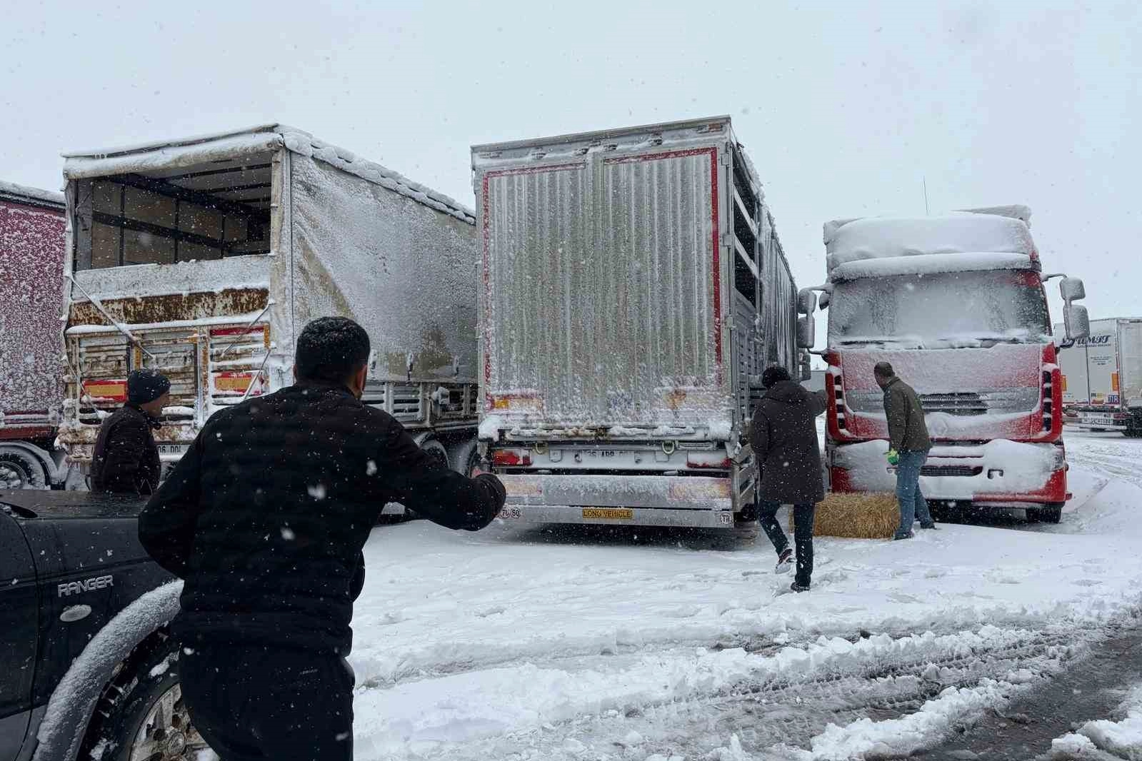 Erzincan, son yılların en yoğun kar yağışlarından birine teslim olurken, şehirlerarası ulaşımda da kritik saatler yaşanıyor. Kars’tan yüklenen ve Ankara istikametine seyir halinde olan 6 tır dolusu yaklaşık 200 büyükbaş hayvan, dondurucu soğuk ve kar yağışı nedeniyle Erzincan-Sivas karayolunda mahsur kaldı. Sakaltutan ve Kızıldağ geçitlerinin ağır tonajlı araç trafiğine kapatılması üzerine ilerleyemeyen sevkiyat tırları, Erzincan Binali Yıldırım Üniversitesi Kavşağı’nda bekletilmeye alındı. Uzun süren bekleyiş, araçlardaki hayvanlar için hayati risk oluşturmaya başlayınca devreye devletin şefkat eli girdi.
