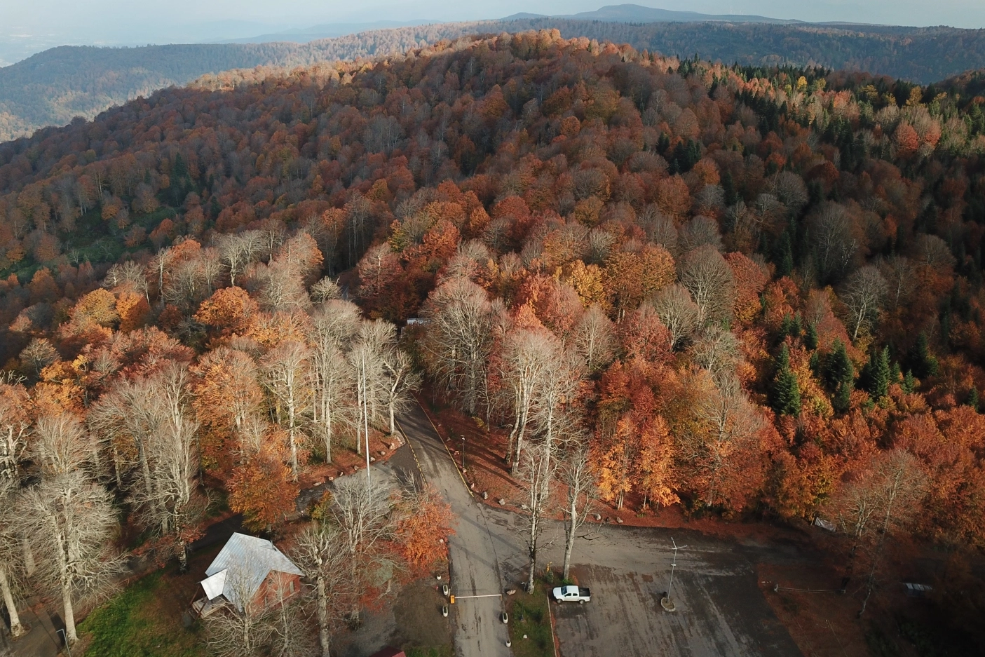 Samanlı Dağları’nın 1640 rakımlı zirvesi Kartepe’nin eteklerinde bulunan Kuzuyayla Tabiat Parkı’ndaki ağaçlar, sonbaharın gelişiyle sarı, turuncu ve yeşilin farklı tonlarına büründü. Sonbaharın izleri, yere dökülen ağaç yapraklarının oluşturduğu manzarayla belirginleşti. Renk cümbüşü dron ile görüntülendi.