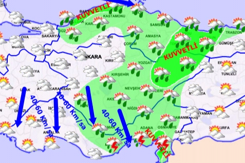 Yağışların; Batı Karadeniz kıyıları, Doğu Karadeniz, Doğu Anadolu, Güneydoğu Anadolu'nun doğusu ile Ordu, Tokat, Sivas, Kahramanmaraş, Osmaniye, Adana'nın doğusu ve Hatay kıyılarında yerel kuvvetli olması bekleniyor.Hava sıcaklıklarının yurdun kuzey, iç ve doğu kesimlerinde hissedilir derecede azalarak mevsim normallerinin 6 ila 10 derece altında seyredeceği tahmin ediliyor. Rüzgarın; genellikle kuzey ve kuzeybatı, yurdun doğu kesimlerinde güney ve güneybatı yönlerden hafif, ara sıra orta kuvvette, Güney Ege, Akdeniz'in iç kesimleri, İç Anadolu'nun güneyi ve Orta Karadeniz kıyılarında kuzeyli yönlerden, Doğu Anadolu'da güneyli yönlerden kuvvetli olarak esmesi bekleniyor.