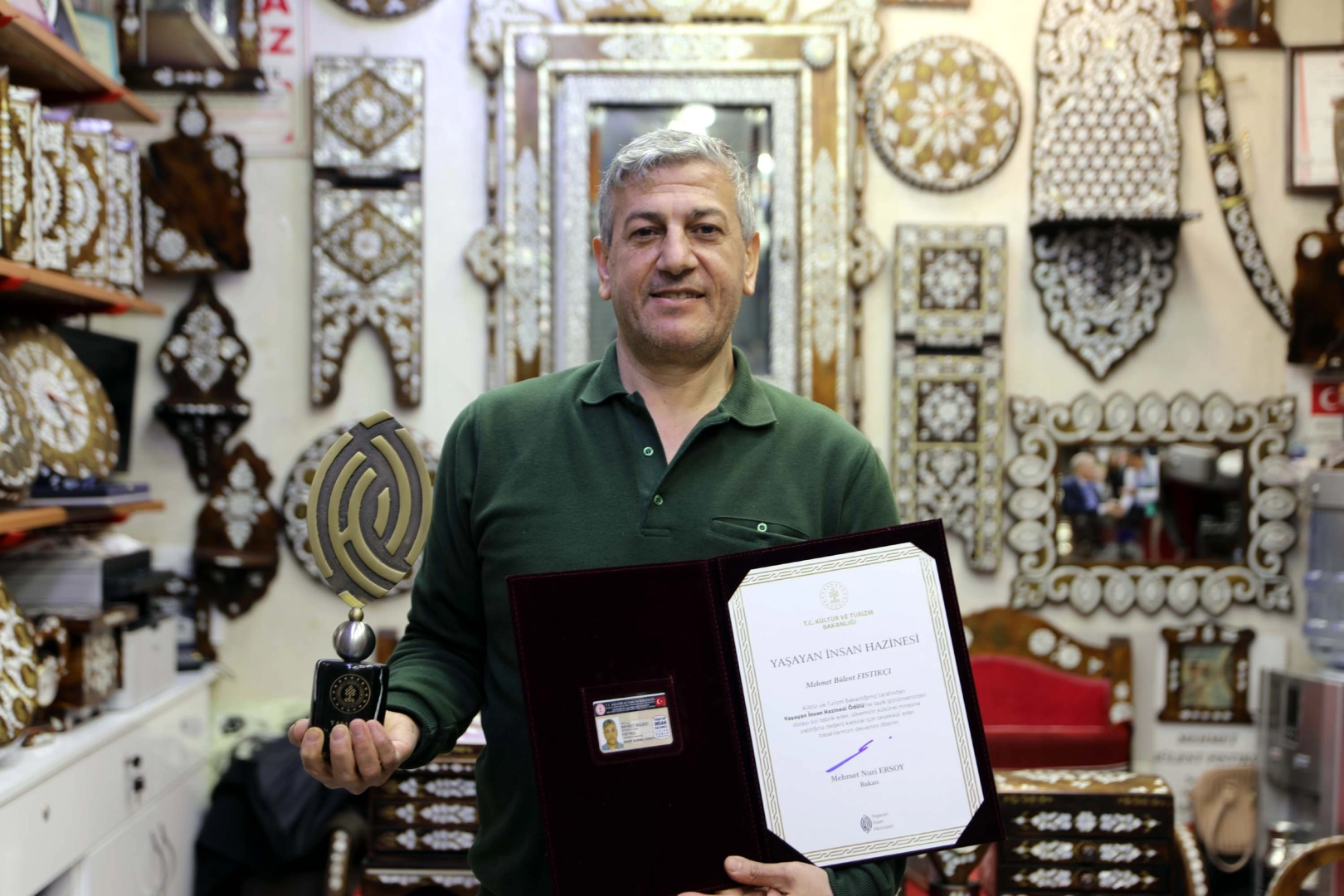GAZİANTEP’te henüz 10 yaşındayken çırak olarak adım attığı sedef kakma sanatında 40’ıncı yılını dolduran Mehmet Bülent Fıstıkçı (50), kültürel mirasa verdiği katkılar nedeniyle “Yaşayan İnsan Hazineleri Ödülü”ne layık görüldü. Fıstıkçı, ödülünü Cumhurbaşkanı Recep Tayyip Erdoğan’ın elinden aldı.