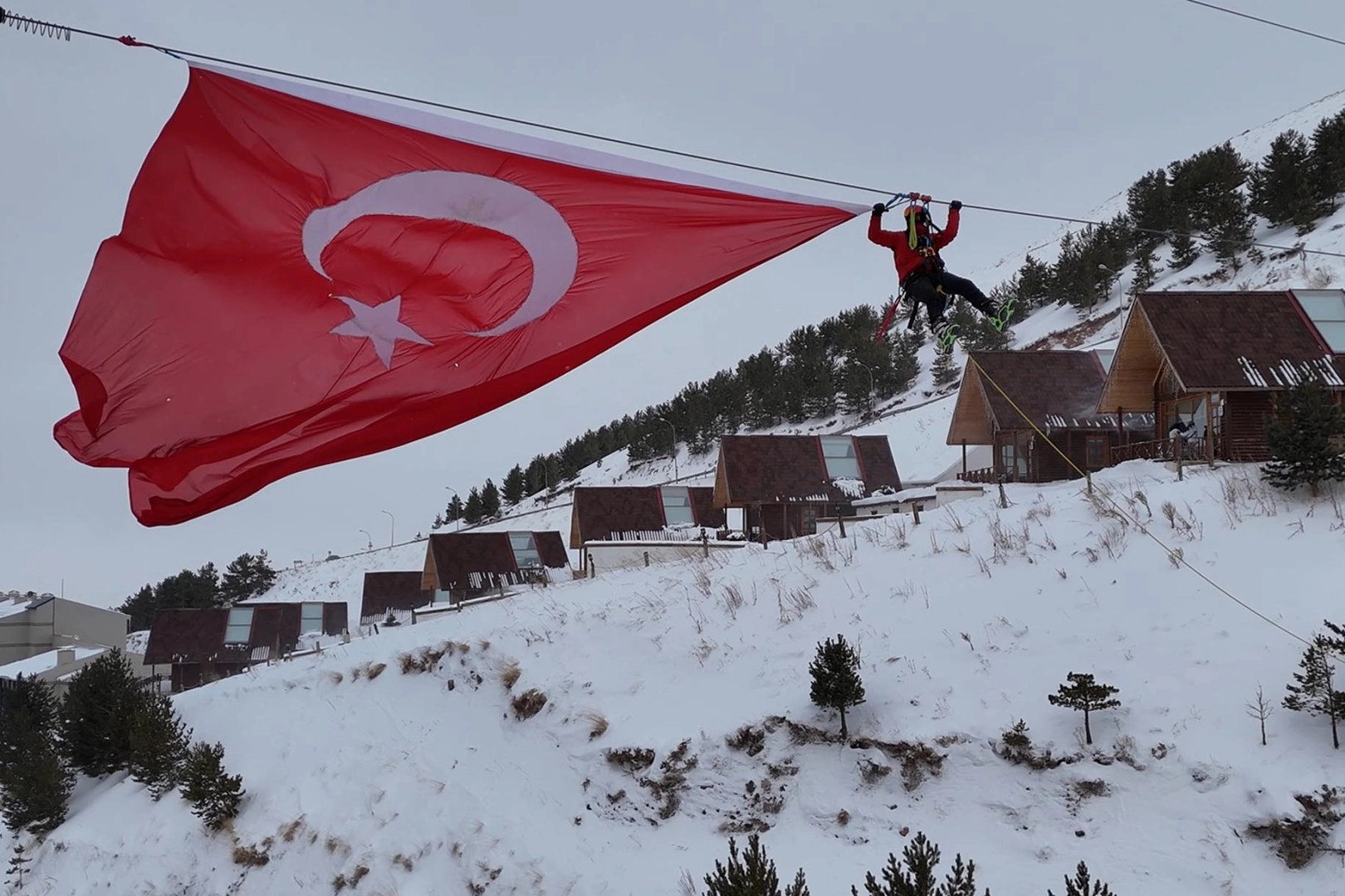 Eylem planı çerçevesinde, kayak merkezinin en stratejik ve en yüksek noktalarından biri seçildi. Ekipler, dondurucu soğuğa ve zorlu kış şartlarına aldırmadan 2 bin 250 metre rakımdaki zipline hattına tırmanış gerçekleştirdi. Dağcılık ve arama kurtarma konusundaki tecrübelerini bu kez milli bir duruş sergilemek için kullanan 6 kişilik ekip, gerekli güvenlik önlemlerini titizlikle alarak operasyonu başlattı. Yerden tam 70 metre yükseklikte bulunan ve normal şartlarda macera tutkunlarının adrenalin yaşamak için kullandığı çelik halatlar, bu kez dev Türk bayrağını taşımak için gerildi.