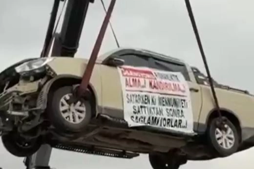Kiraladığı vinçle bayinin önüne gelen vatandaş, hatalı olduğunu iddia ettiği kamyoneti halatlarla bağlayarak metrelerce yükseğe kaldırdı. Aracın, bayinin tabelasının hemen önünde havada sallanması, yoldan geçen sürücülerin ve yayaların meraklı bakışlarına neden oldu. Ancak asıl vurucu nokta, aracın üzerine asılan dev pankarttı.