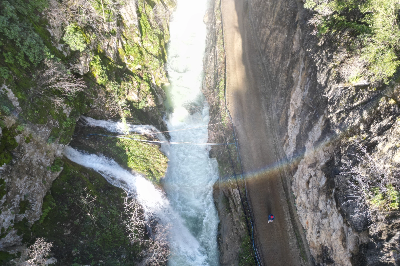 Eriyen kar suları, mevcut şelalenin yaklaşık 20 metre alt bölümünde yer alan kaya oyuğundan akmaya başladı. Yaklaşık 10 metre yükseklikten aşağıya dökülen sular, bölgede ikinci bir şelale oluşturdu. Kanyon içinde yan yana akan iki şelale ve güneş ışıklarıyla oluşan gökkuşağı manzarası, dron ile görüntülendi.