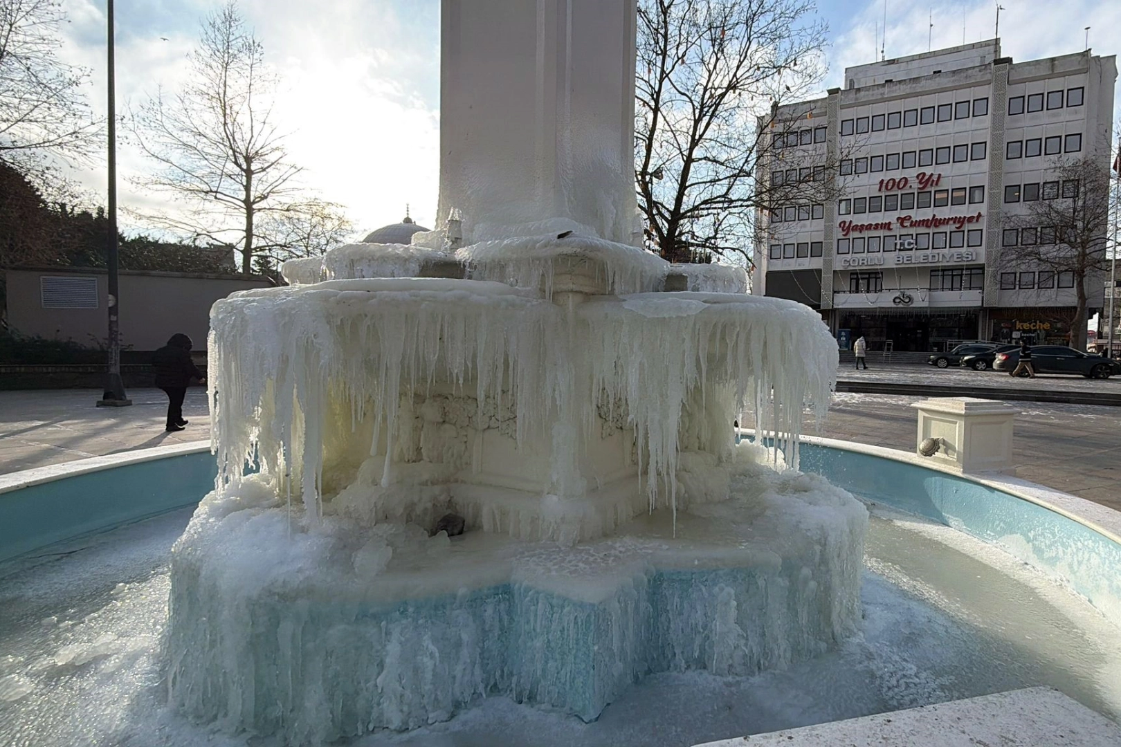 Dondurucu soğuğun en net kanıtı, ilçenin kalbi sayılan Cumhuriyet Meydanı’nda görüldü. Çorlu Belediyesi binasının önünde bulunan büyük süs havuzu, gece boyu etkili olan ayazın etkisiyle tamamen donarak buz pistine döndü. Sabah saatlerinde meydana gelen vatandaşlar, havuzun bu halini görünce şaşkınlıklarını gizleyemedi.