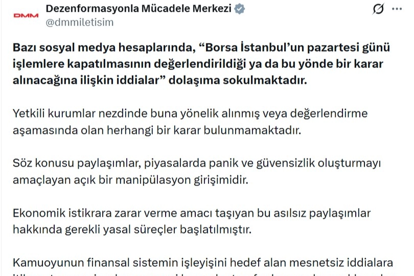 İletişim Başkanlığı bünyesinde faaliyet gösteren Dezenformasyonla Mücadele Merkezi (DMM), sanal medya platformları üzerinde hızla yayılan ve Borsa İstanbul'un işleyişini doğrudan konu alan söylentilere ilişkin detaylı bir resmi duyuru yayımladı. Sanal medya hesaplarında dolaşıma sokulan "Borsa İstanbul'un pazartesi günü işlemlere kapatılmasının değerlendirildiği ya da bu yönde kesin bir karar alınacağına ilişkin iddialar" şeklindeki ifadelerin gerçeği yansıtmadığı açıklandı. DMM tarafından kamuoyunu doğru bilgilendirmek amacıyla yapılan bu kapsamlı açıklamada, söz konusu iddiaların hiçbir gerçeklik payı taşımadığı net bir dille ifade edildi.