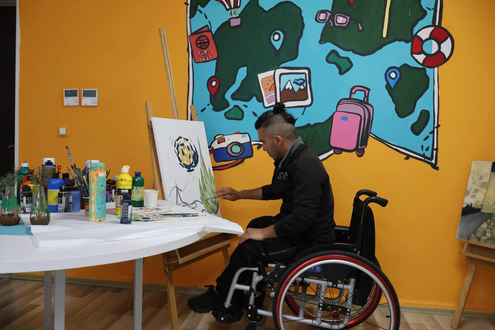 Muğla'nın Menteşe ilçesinde yaşayan 28 yaşındaki Mustafa Gürbüz, 8 yaşında geçirdiği kist ameliyatı sonrası bedensel engelli kaldı. Ancak o hayata küsmek yerine sanata tutunmayı seçti. 9 yıl önce Uluslararası Gençlik Merkezi Sanat Atölyesi ile tanışan Gürbüz, tekerlekli sandalyesiyle aralıksız katıldığı çalışmalarda resim, heykel ve seramik alanlarında kendini büyük ölçüde geliştirdi. Yaşama sevincini fırçasına ve çamuruna yansıtan genç sanatçı, atölye hocalarının da desteğiyle kendine özgü birçok eser üretti.