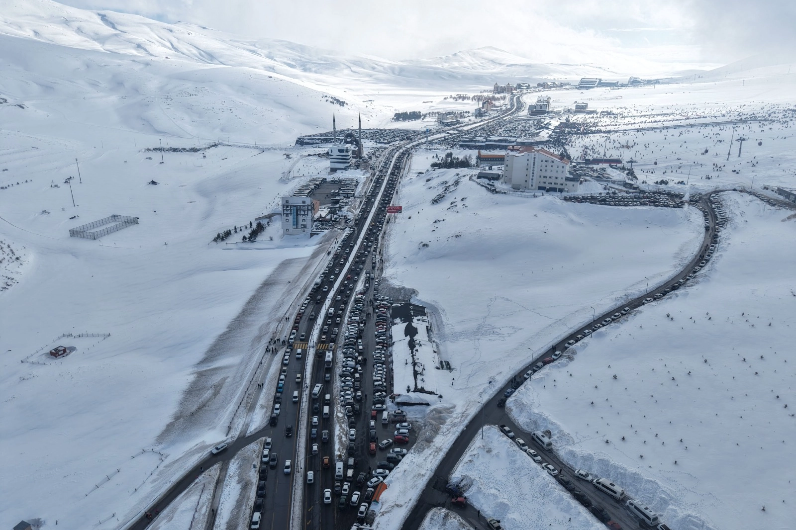 Türkiye’nin önde gelen kış sporları ve turizm merkezlerinden biri olan Erciyes Kayak Merkezi, sömestir tatilinin son gününde yoğun ziyaretçi akınına uğradı. Kayseri Büyükşehir Belediyesi’nin 350 milyon avroluk yatırımıyla hayata geçirilen Erciyes Master Planı kapsamında uluslararası standartlara kavuşan merkezde, tatilcilerin dönüş hareketliliğiyle birlikte trafik yoğunluğu yaşandı.