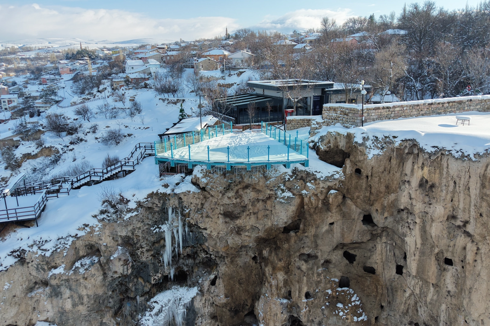 Kayseri’nin tarihi ve doğal güzellikleriyle ünlü ilçesi Bünyan, turizmde altın çağını yaşıyor. Kayalıkların üzerine, yerden 250 metre yükseğe inşa edilen ve ziyaretçilerine "bulutların üzerinde yürüyormuş" hissi veren cam teras, geçen yıl 100 binin üzerinde ziyaretçiyi ağırladı. Kışın beyaz örtüyle kaplanan bu eşsiz yapı havadan görüntülenirken, Belediye Başkanı Selahattin Metin ikinci cam terasın müjdesini verdi.