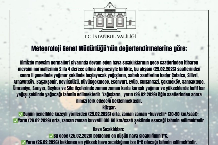 İstanbul Valiliği, Meteoroloji Genel Müdürlüğü’nden alınan veriler doğrultusunda megakent için kritik bir hava durumu uyarısı yayımladı. Mevsim normallerinde seyreden hava sıcaklıklarının gece saatlerinden itibaren 2 ila 4 derece birden düşeceği belirtilirken, fırtınanın ulaşımda aksamalara yol açabileceği vurgulandı. 25 Şubat akşamı başlayacak olan yağışlı ve rüzgarlı havanın, 26 Şubat öğle saatlerine kadar şehri etkisi altına alması bekleniyor.