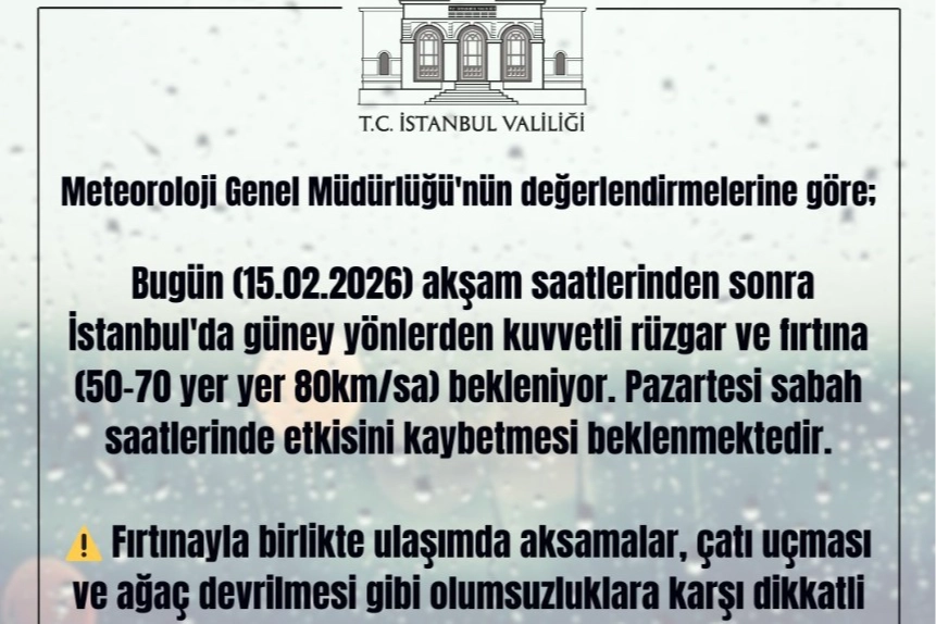 İstanbul Valiliği, kent genelinde akşam saatlerinden itibaren etkili olması beklenen şiddetli fırtına ve kuvvetli rüzgara karşı vatandaşları uyardı. Fırtınanın hızının yer yer 80 kilometreye ulaşması bekleniyor.