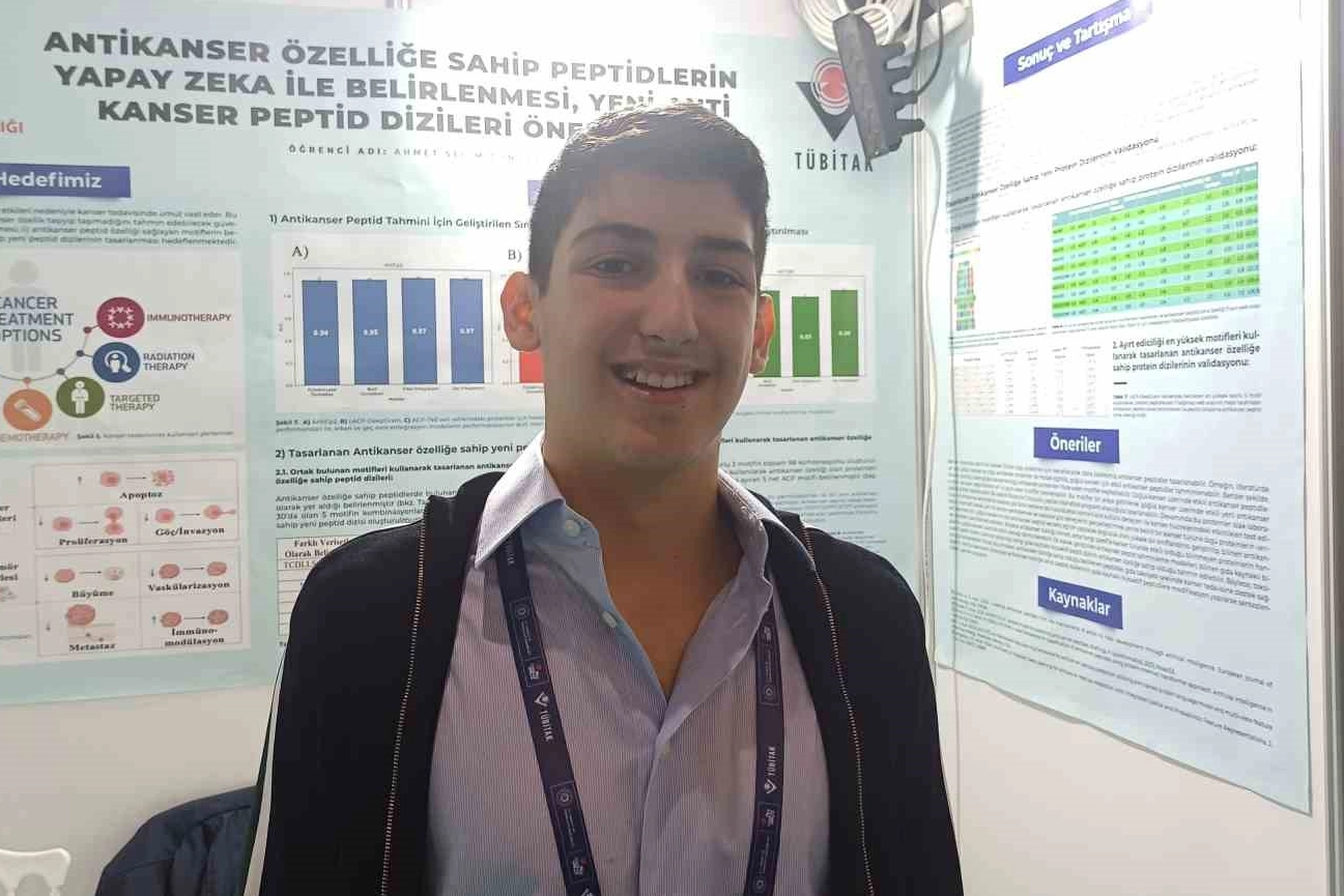 Kayseri’de lise 11. sınıf öğrencisi 17 yaşındaki Ahmet Selim Güngör, biyoloji alanında hazırladığı “Antikanser Özelliğe Sahip Peptidlerin Yapay Zeka ile Belirlenmesi ve Yeni Anti Kanser Peptid Dizileri Önerilmesi” projesiyle dikkat çekti. Genç öğrenci, kanser tedavisinde görülen yan etkileri azaltmayı hedeflediğini söyledi.