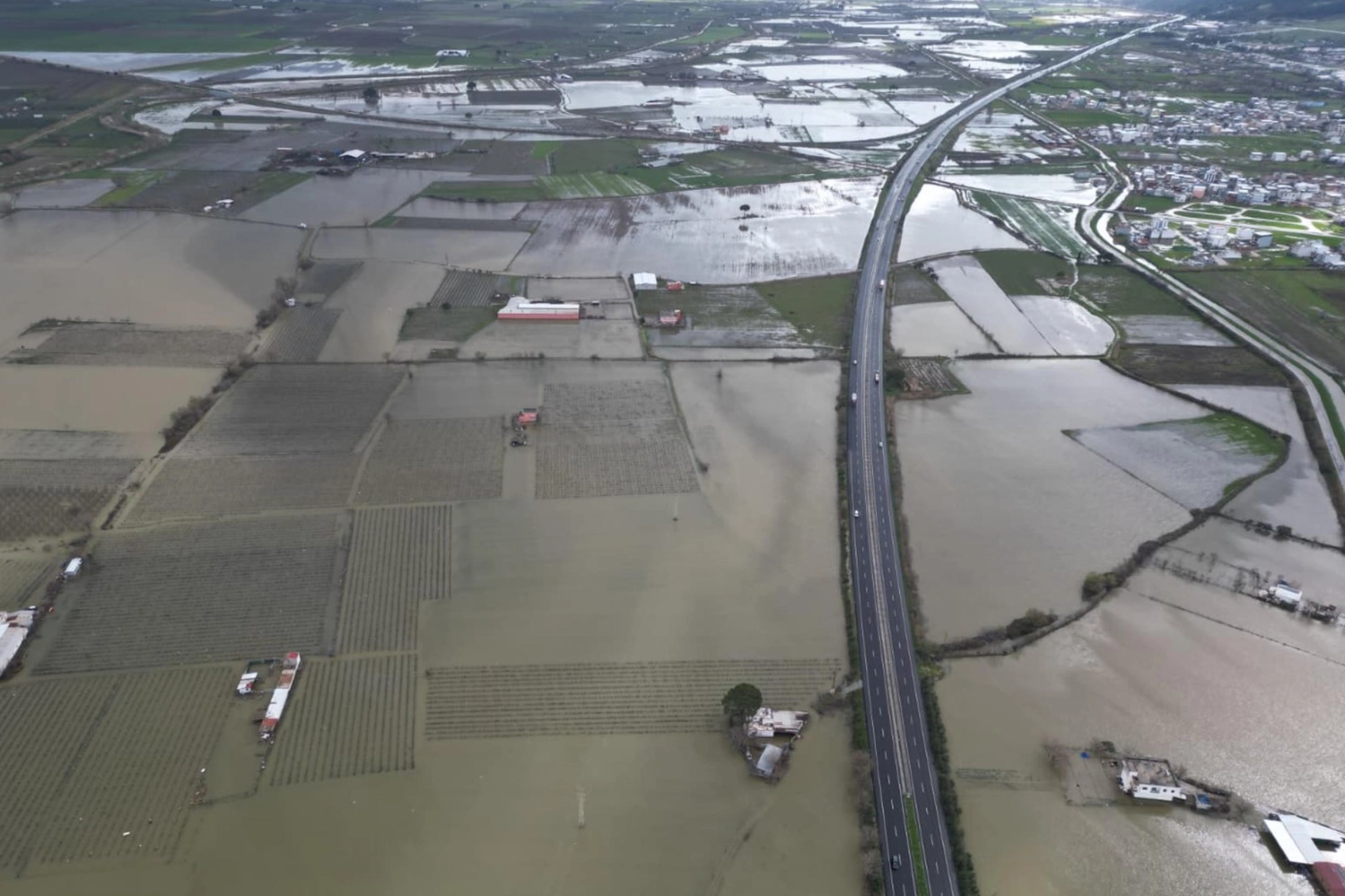 Taşkın sonrası suyla kaplanan Gediz Ovası'ndaki manzara, dron kameralarıyla havadan görüntülendi. Görüntülerde, bereketli toprakların yerini geniş bir su kütlesine bıraktığı ve bazı bağ evlerinin sadece çatılarının göründüğü dikkat çekti. Manisa-İzmir ulaşımını sağlayan çevre yoluna kadar yaklaşan sular, tarımsal üretimin kalbi olan ovada hayatı durma noktasına getirdi.