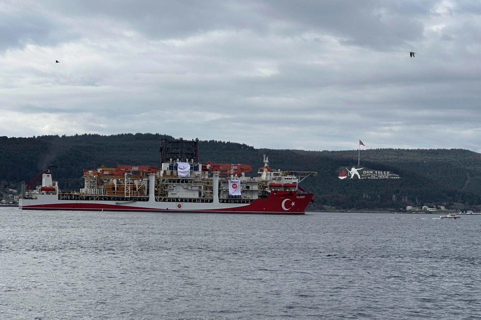 Türkiye’nin denizlerdeki arama ve tarama faaliyetlerini bir üst lige taşıyan enerji filosuna taze kan geldi. Fatih, Yavuz, Çağrı Bey, Kanuni ve Abdülhamid Han’dan sonra ailenin 6. üyesi olan 'Yıldırım' sondaj gemisi, saat 13.30 sularında Ege Denizi yönünden Çanakkale Boğazı’na giriş yaptı. Heybetli gövdesiyle saat 15.30 sıralarında Çanakkale önlerine ulaşan gemiye, geçiş güvenliği için Kıyı Emniyeti Genel Müdürlüğü’ne ait ‘Kurtarma-10’ römorkörü ve Sahil Güvenlik botları eşlik etti.
