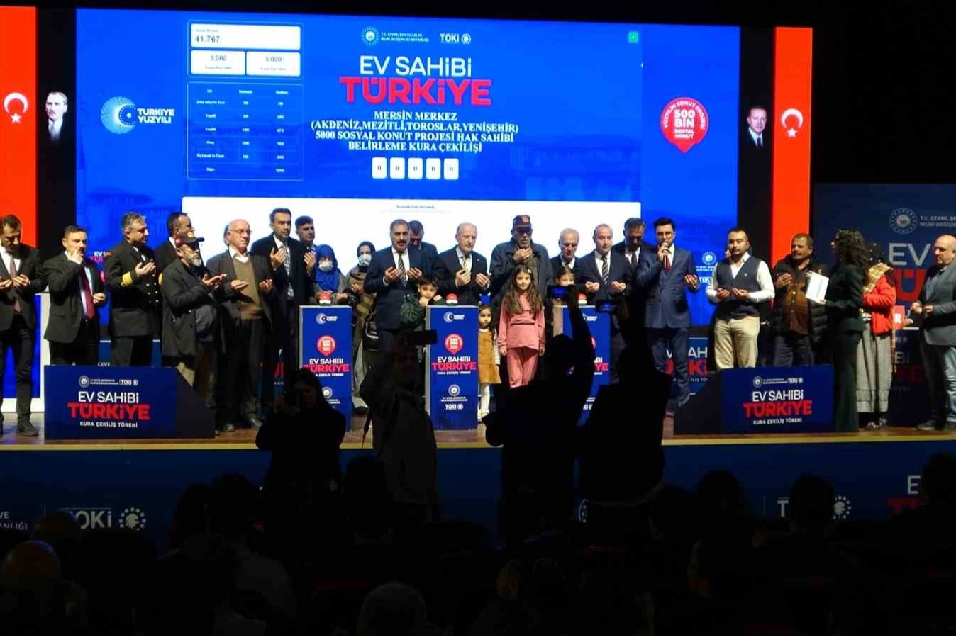 Recep Tayyip Erdoğan tarafından ilan edilen ve “yüzyılın konut projesi” olarak duyurulan 500 bin sosyal konut hamlesi kapsamında, Mersin’de hak sahiplerini belirlemek amacıyla kura çekilişi gerçekleştirildi. TOKİ tarafından Mersin Kültür Merkezi’nde düzenlenen programda 8 bin 190 vatandaş noter huzurunda yapılan çekilişle konut sahibi olmaya hak kazandı.