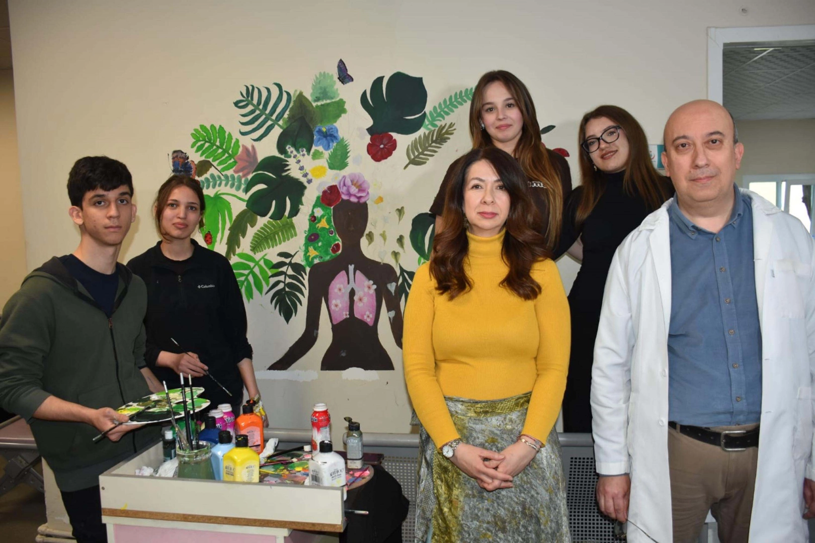 İzmir'de lise öğrencileri, Kanser Haftası kapsamında onkoloji servisi duvarına hastalar için moral amacıyla çiçek açan akciğer figürü çizdi.