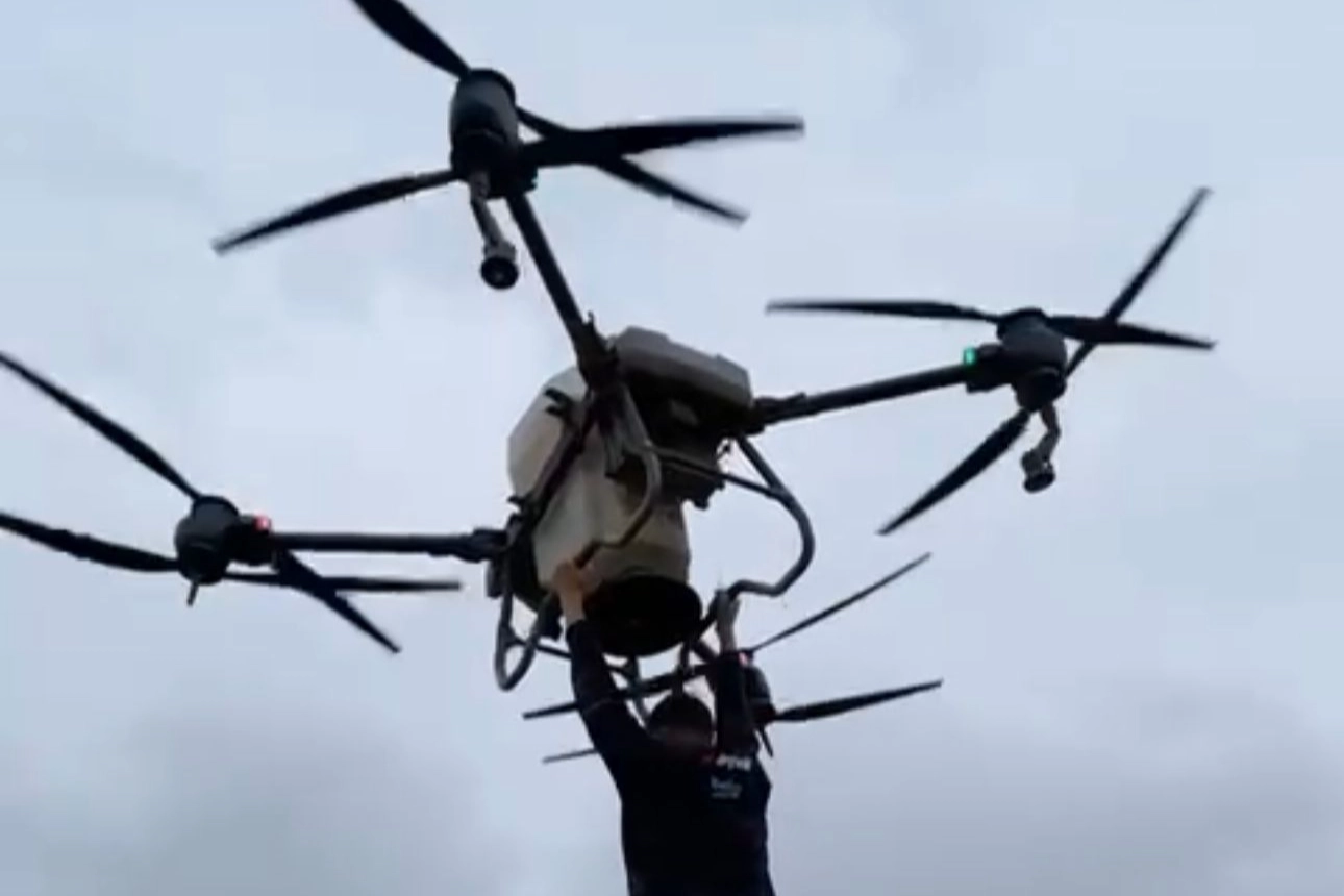 Samsun'un Bafra ilçesine bağlı Kelikler Mahallesi'nde çeltik tarlasını ilaçlayan bir çiftçi, devasa tarım dronuna tutunup havalanarak tarlanın diğer ucuna uçtu ve o anlar sanal medyayı salladı.
