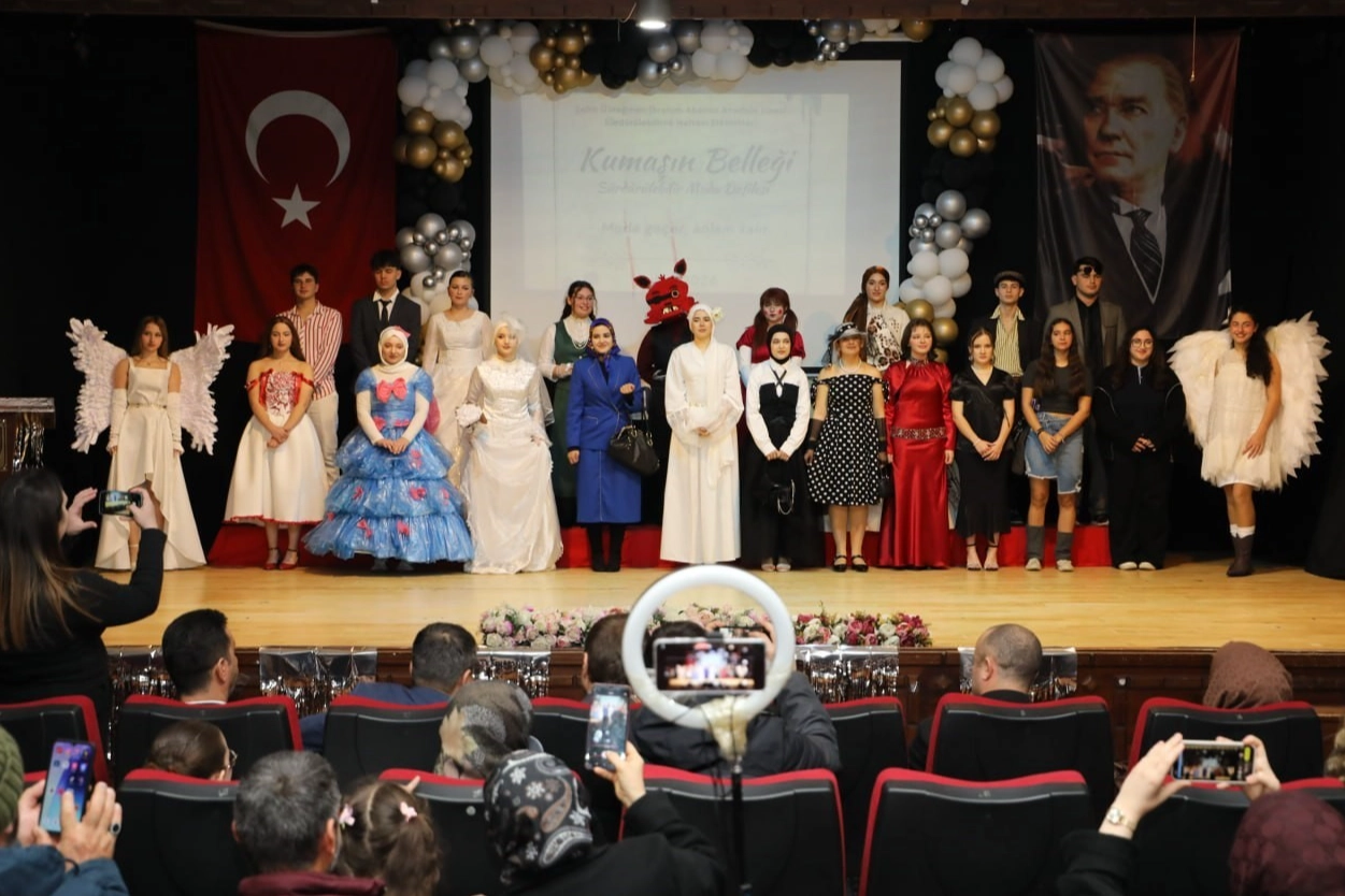 Sakarya Karasu Şehit Üsteğmen İbrahim Abanoz Anadolu Lisesi öğrencileri, "Yeşil Vatan" projesi kapsamında atık malzemelerden kıyafet tasarladı. Üniversiteye hazırlık test kağıtlarından yapılan elbisenin damga vurduğu defilede, gençler "hızlı moda" sektörüne ve israfa karşı anlamlı bir mesaj verdi.