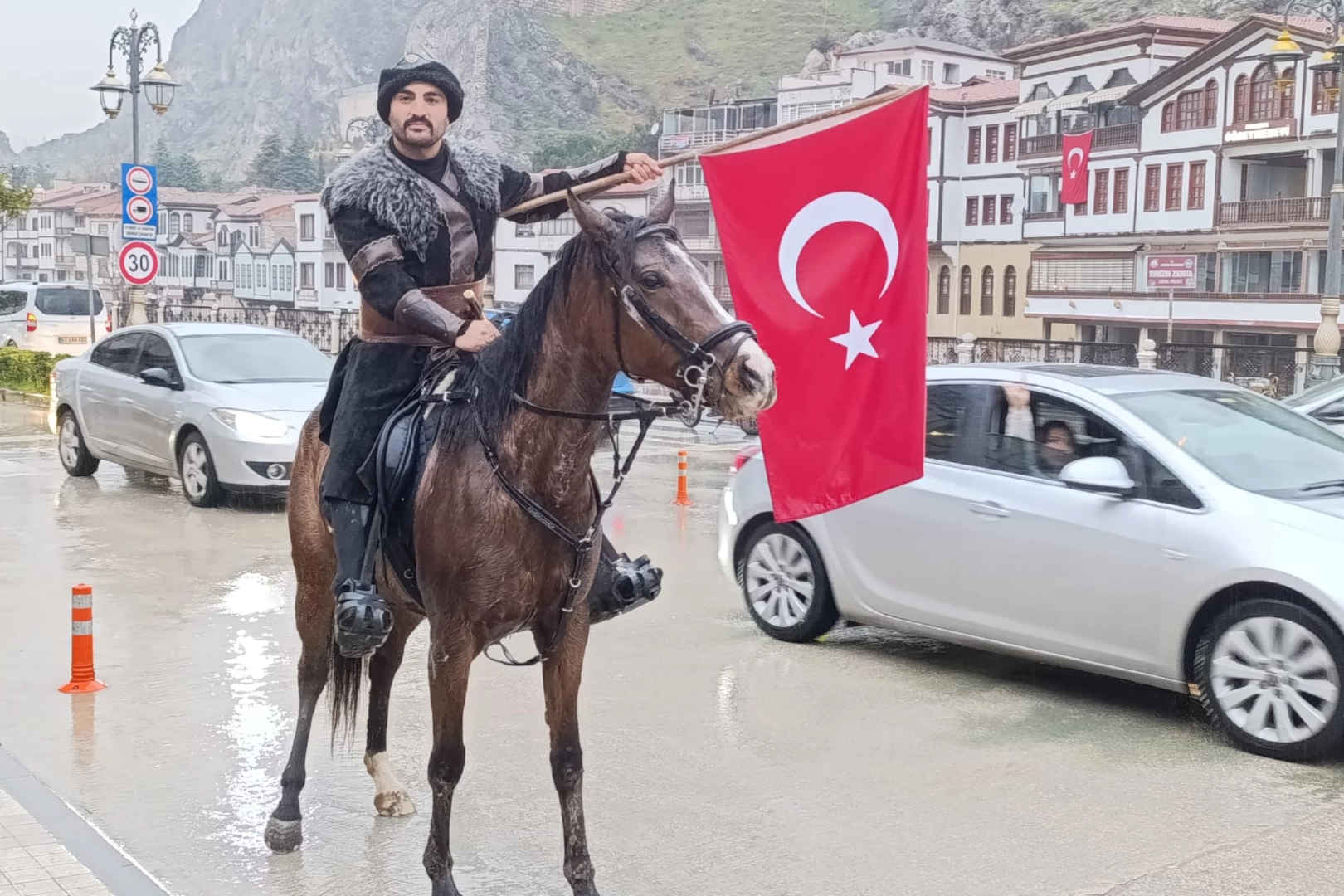 Türk bayrağına yönelik gerçekleştirilen saygısızlığa dikkat çekmek isteyen Sümmani Yılmaz (36), Tokat’tan yola çıkarak atı Rüzgar ile Amasya’ya ulaştı. Yağışlı havaya rağmen yolculuğunu sürdüren Yılmaz, elinde Türk bayrağıyla Amasya sokaklarında at üzerinde şehir turu attı. Tarihi asker kıyafetiyle dikkat çeken Yılmaz, protestosunu İstanbul’a kadar devam ettirmeyi planladığını ifade etti.