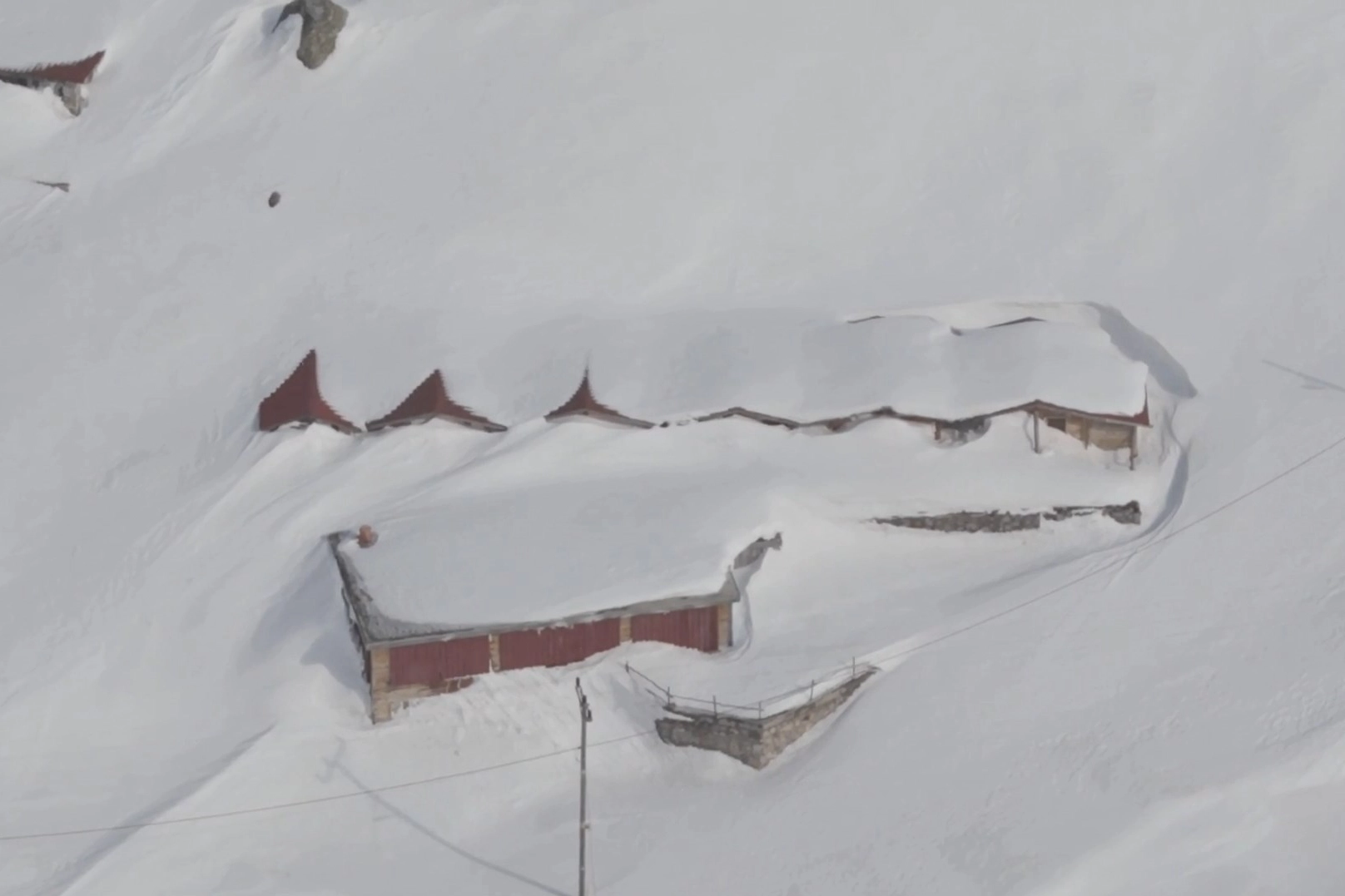 7 kişilik bir grup, beyaz örtüyle kaplanan yaylada tulum ezgileri eşliğinde gezinti yaptı. Kar kalınlığının ev seviyesini aştığı anlar dron kamerasıyla havadan görüntülendi.