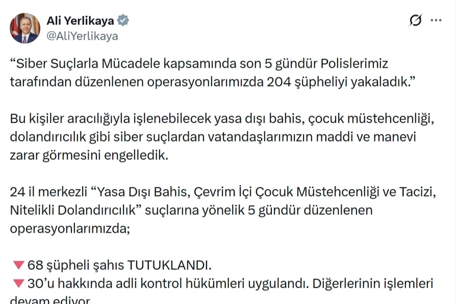 İçişleri Bakanı Ali Yerlikaya, polis tarafından düzenlenen operasyonu sosyal medya hesabından duyurdu. Buna göre; 'Yasa dışı bahis', 'Çevrimiçi çocuk müstehcenliği ve tacizi', 'Nitelikli dolandırıcılık' suçları kapsamında düzenlenen operasyonlarda 204 şüpheli yakalandı. Şüphelilerin 68'i tutuklandı, 30'u hakkında adli kontrol hükümleri uygulandı, diğerlerinin işlemleri devam ediyor. Şüphelilerin; yasa dışı bahis ve kumar oynattıkları, yasa dışı bahis sitelerinde para nakline aracılık ettikleri, reklamını yaptıkları, müstehcen çocuk görüntüsü barındırdıkları, sosyal medya platformları ve oltalama (phishing) siteleri üzerinden 'kamu görevlisi, ürün/hizmet satışı, düşük faizli kredi' temalarını kullanarak vatandaşları dolandırdıkları, kişisel verilerin paylaşımı ve sorgulama konularında paylaşımlar yaptıkları tespit edildi.