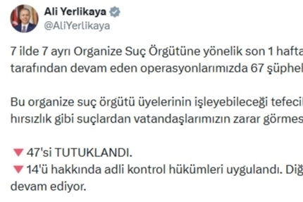 Bakan Yerlikaya'nın sosyal medya hesabından yaptığı açıklamaya göre; 7 ilde 7 ayrı organize suç örgütüne yönelik son 1 haftadır jandarma tarafından devam eden operasyonlarda 67 şüpheli yakalandı. Buna göre; Erzurum'da 6136 Sayılı Kanun'a Muhalefet suçu kapsamında silah kaçakçılığı yaptıkları, Antalya'da örgütlü şekilde baskı, darp, cebir ve tehditle iş yerlerinden para aldıkları, vatandaşlara baskı ve şiddet uygulayarak işletmelerini devraldıkları, Kahramanmaraş ve Şanlıurfa'da tefecilik yaptıkları, Sakarya'da ehliyet sınavına giren şahısların sınavdan geçmelerine aracılık ettikleri, Kırklareli'nde insan ticareti suçunu işledikleri, Tekirdağ'da organize şekilde nitelikli hırsızlık yaptıkları tespit edildi. Şüpheliler hakkında, savcılık tarafından soruşturma başlatıldı. Şüphelilerden 47'si tutuklandı, 14'ü hakkında adli kontrol hükümleri uygulandı. Diğerlerinin işlemleri devam ediyor.