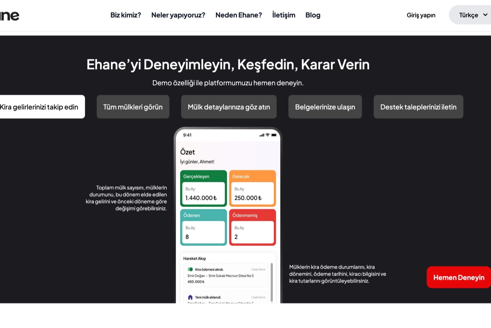 Demirel, "Mülk yönetimini baştan sona üstlenerek, ev sahiplerine güvenilir ve zahmetsiz bir deneyim sunuyoruz" dedi. Demirel'in açıklamasına göre Ehane, kira tahsilatı, gider takibi, bakım onarım işleri ve hukuki süreçler dahil olmak üzere, ev sahiplerinin yükünü hafifleten birçok hizmeti tek platformda sunuyor. Sözleşme hazırlama, bildirim gönderme, tahliye işlemleri ve evrak yönetimi gibi zaman alan adımlar da platformun uzman ekibi ve çözüm ortakları tarafından yürütülüyor. Kullanıcılar, mobil uygulama ve web üzerinden tüm süreçleri şeffaf biçimde takip edebiliyor. Anlık bildirimler ve raporlarla mülklerinin durumunu kolayca görürken, çağrı merkezi üzerinden asistan desteği de alabiliyorlar. Web sitesi, yurt dışındaki mülk sahipleri için İngilizce olarak da hizmet veriyor.Demirel, “Mülk sahiplerinin en büyük ihtiyacı güvenilir, şeffaf ve zahmetsiz bir hizmet. Ehane ile amacımız, mülk yönetiminin düzenli, sorunsuz ve profesyonel şekilde ilerlemesini sağlamak. Kısaca, 'Siz kirayı alın, biz sorunları çözelim' diyoruz ve Türkiye'de bu alanda yeni bir sayfa açıyoruz" diye konuştu.
