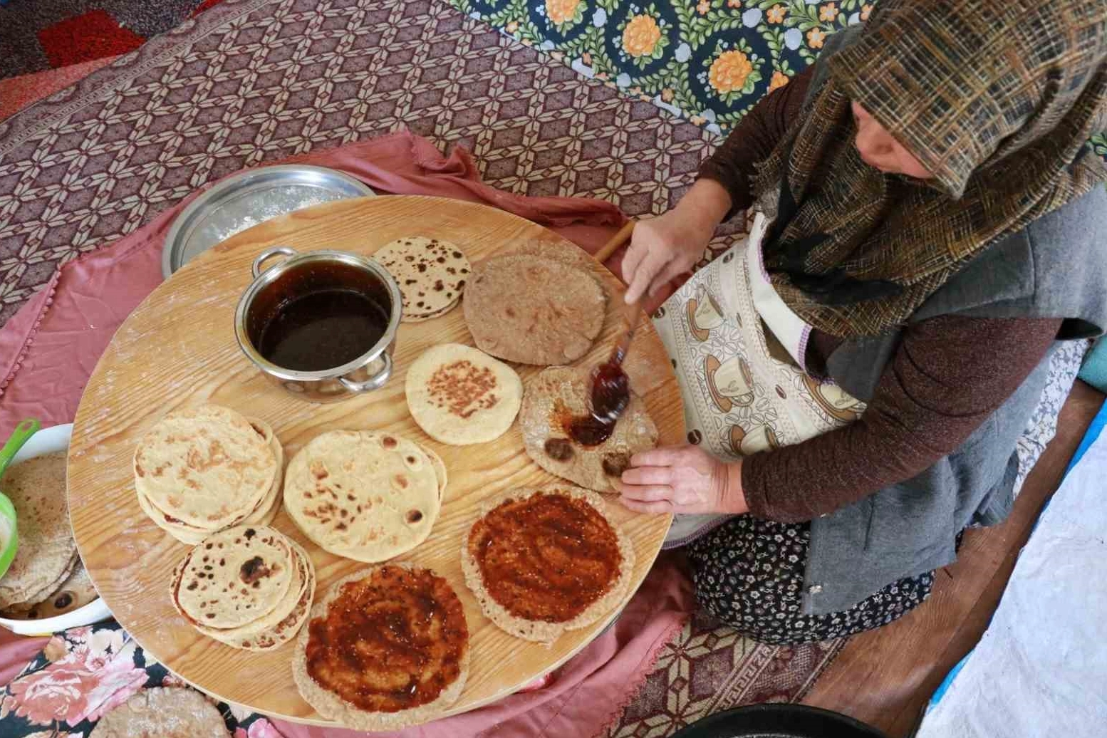 En can alıcı aşamada ise tereyağı unla kavrulup içine pekmez eklenerek kaynatılıyor; elde edilen bu yoğun karışım, sacdan alınan ekmeklerin üzerine sürülerek şölen tamamlanıyor.