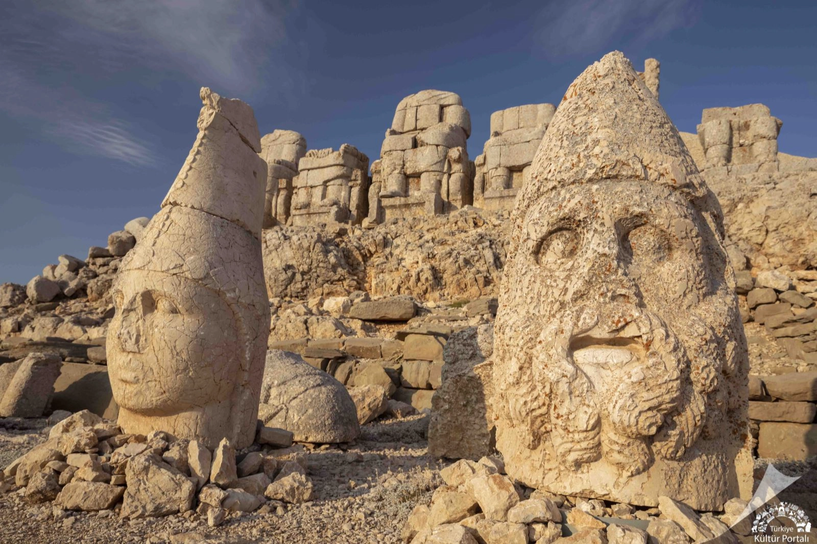 Nemrut Dağı’nın simgesi haline gelen dev heykeller, tümülüsün doğu, batı ve kuzey teraslarına yayılmış durumda. En iyi korunmuş alan olan doğu terasında, Greko-Pers üslubunda yapılmış tanrı heykelleri dikkat çekiyor. Yaklaşık 8–10 metre yüksekliğindeki bu heykeller, tahtlarına oturur biçimde tasarlanmış olsa da günümüzde gövdeleri kısmen yıkılmış, başları ise önlerinde sıralanmış halde bulunuyor.