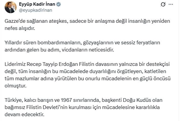 AK Parti'li İnan, Gazze'de ateşkesin sağlanmasına ilişkin sosyal medya hesabından açıklama yaptı. İnan, "Gazze’de sağlanan ateşkes, sadece bir anlaşma değil insanlığın yeniden nefes alışıdır. Yıllardır süren bombardımanların, gözyaşlarının ve sessiz feryatların ardından gelen bu adım, vicdanların neticesidir. Liderimiz Recep Tayyip Erdoğan Filistin davasının yalnızca bir destekçisi değil, tüm insanlığın bu mücadelede duyarlılığını örgütleyen, katledilen tüm mazlumlar adına yürütülen bu onurlu mücadelenin en güçlü öncüsü olmuştur. Türkiye, kalıcı barışın ve 1967 sınırlarında, başkenti Doğu Kudüs olan bağımsız Filistin devletinin kurulması için mücadelesine kararlılıkla devam edecektir.